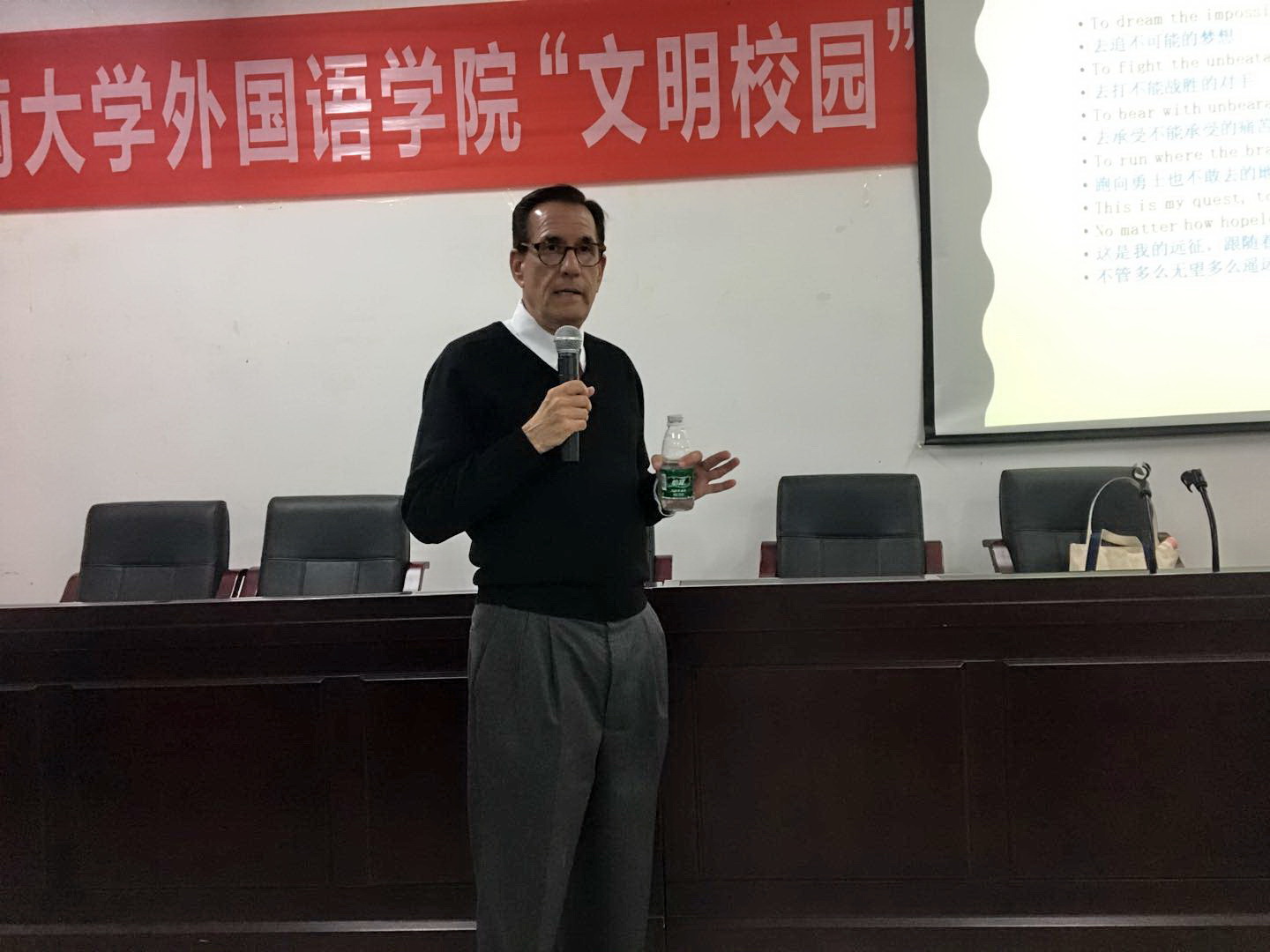 在提问环节,现场师生就如何培养员工创新精神、商务英语授课技巧、读博、以及SDSU如何评估教师与依山·辛格博士展开了激烈的探讨。最后依山.辛格博士深情演唱了百老汇喜剧《唐吉可德里》的插曲 --《追梦无悔》。希望大家不论是在教学还是学习的过程中以不懈的创新精神努力奋进,勇敢追求自己的梦想。