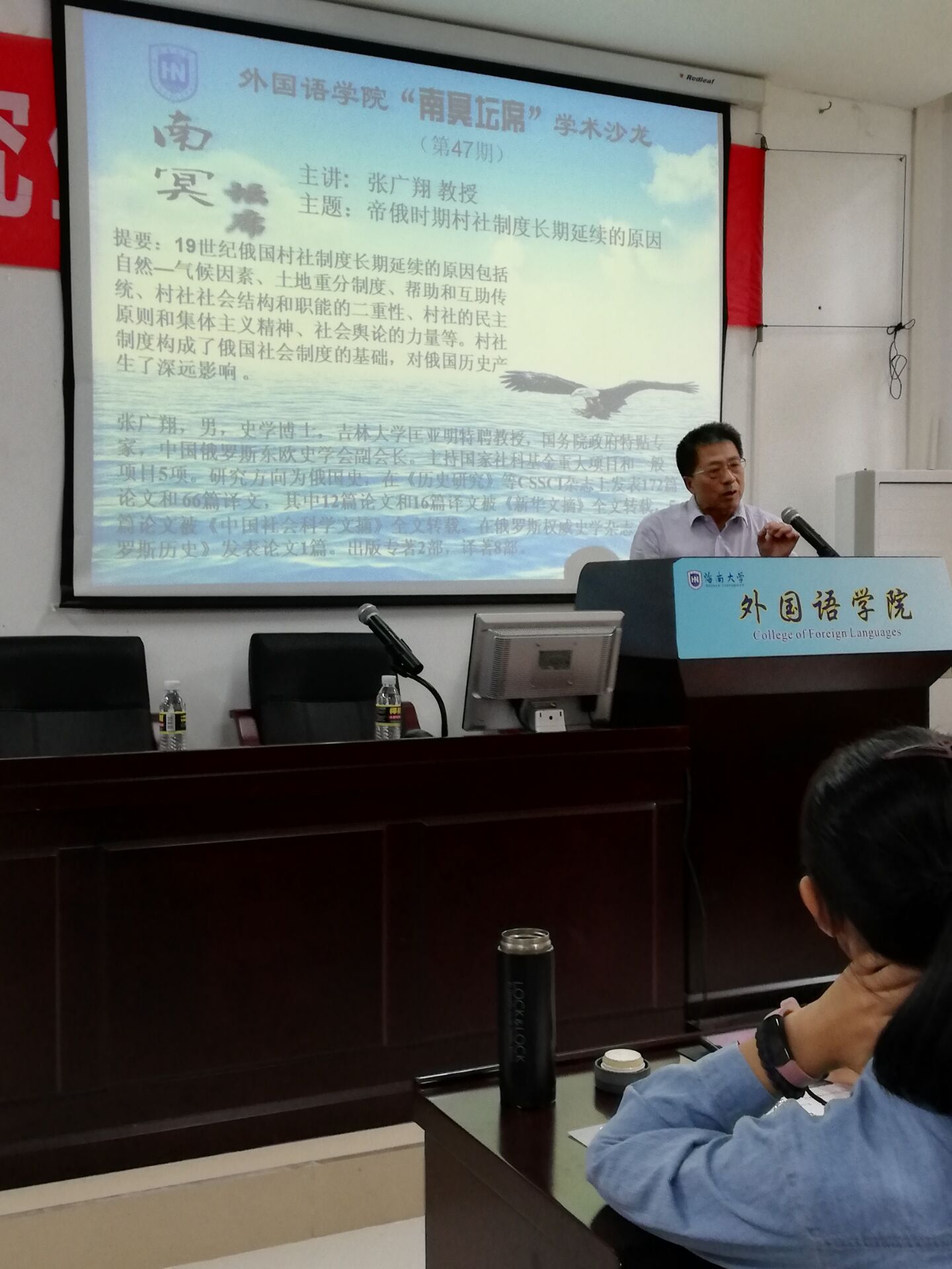 据悉,张广翔教授是史学博士,吉林大学匡亚明特聘教授,国务院政府特殊津贴专家,中国俄罗斯东欧史学会副会长,吉林省第六批拔尖创新人才。主持国家社科基金重大项目和一般项目5项。研究方向为俄国史,在《历史研究》等CSSCI杂志上发表172篇论文和66篇译文,其中12篇论文和16篇译文被《新华文摘》全文转载,5篇论文被《中国社会科学文摘》全文转载。在俄罗斯权威史学杂志《俄罗斯历史》发表论文1篇。出版专著2部,译著8部。 (摄影、撰稿:2018级文学硕士 方慧琴)