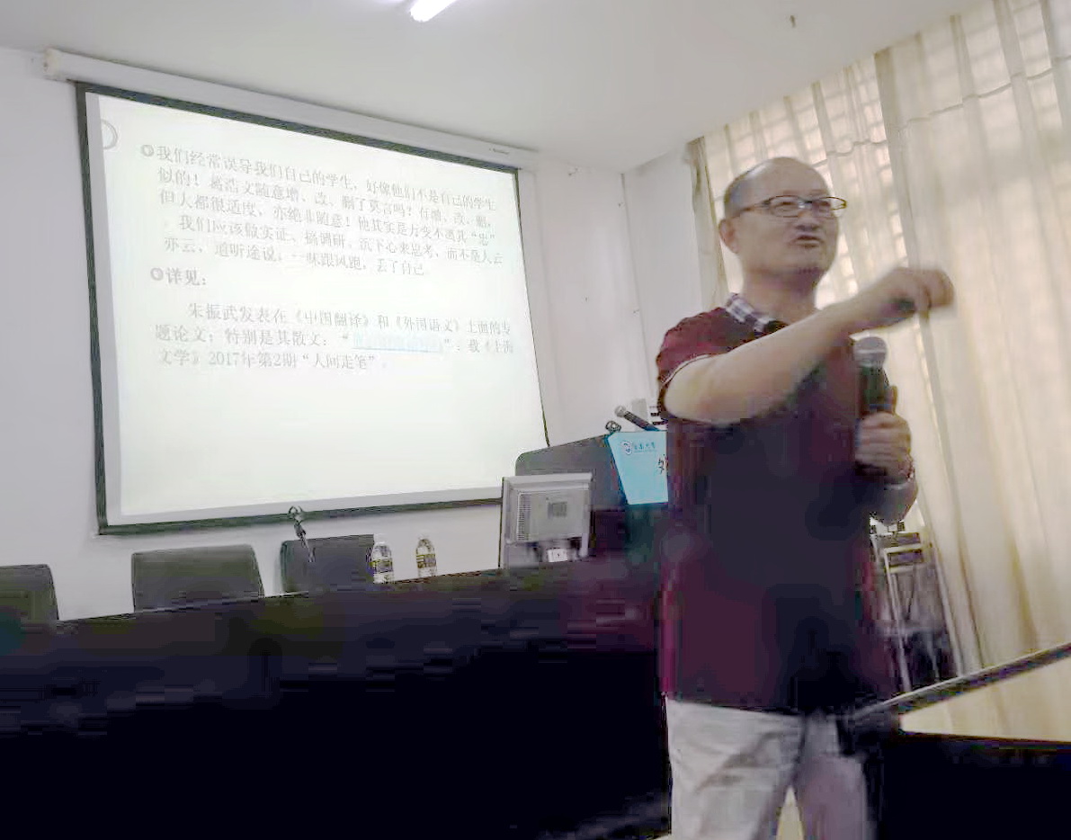 朱教授指出了在文学翻译的教与学中存在的问题:首先在文学修养方面,教学主体素养不够,阅读量小,学习内容肤浅,缺少欣赏不同文学作品的情趣。其次在翻译方面,偏重技能,闭门造车,对自我要求不高,满足于自我欣赏。朱教授提出,翻译时要坚持紧贴原作、删减冗赘、注疑释点、力求晓畅等译事十法;避免言词晦涩、不求甚解、甚至草率抄袭等译事十诫。对于如何确处理原文与译文的关系,朱教授认为翻译需正确处理理论与实践的关系,作者与译者、读者的关系。翻译不能照搬,不可迷信字典,需学习字词的原意,转化义,引申义等,依据上下文灵活处理,明晰劣译与伪译的关系。他认为不精一艺不谈译,即只有对原文了解透彻的基础上才能谈翻译,也才能译出既符合原文风格又突破原文枷锁的作品,所以翻译需照顾到原作的形式,还要考虑到其内容,把握其整体风格,从目标语读者出发,整体才能朴真、素雅、自然。最后朱教授认为,关于文学翻译的标准问题,译者需掌握陌生化和可读性间的有机平衡,在贴对原文的基础上保证汉语读者能够流畅地阅读,这样的译文才不失为好作品。