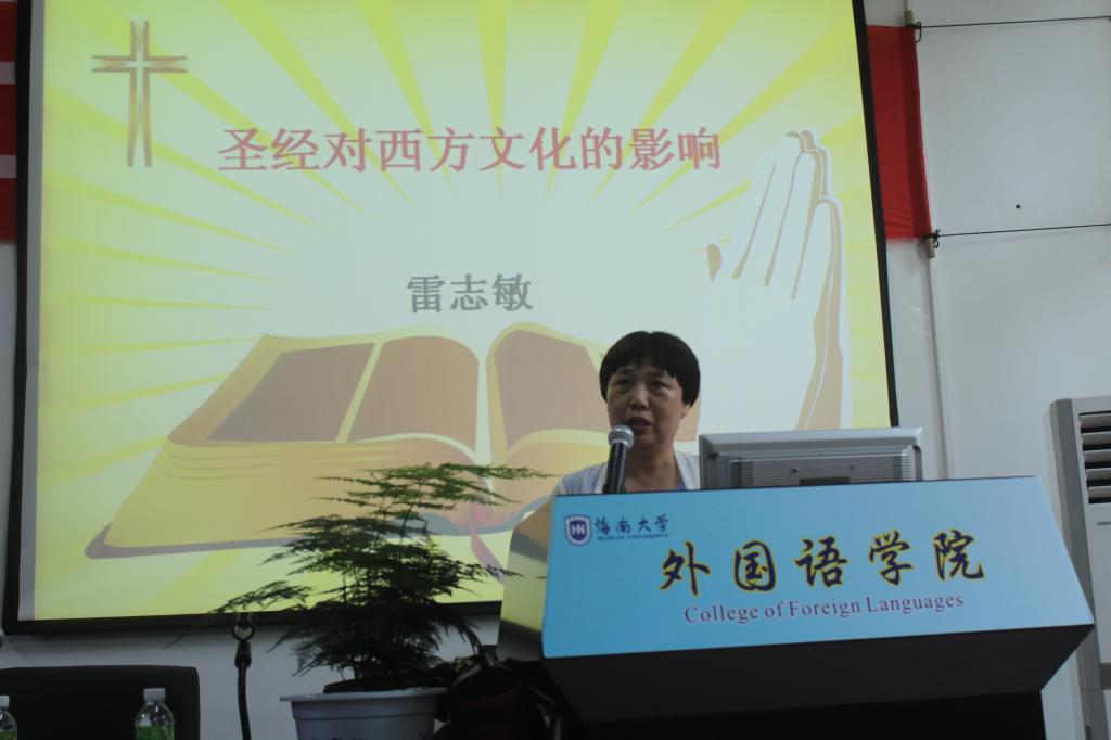 2016年4月26日下午3时,社科楼C115迎来了威廉体育williamhill“南冥坛席”第九场学术沙龙。本场沙龙的主题是“如水银泻地——《圣经》对西方的影响”,由长沙公司外语系主任雷志敏教授主讲,杨国良教授主持。吸引了大批对圣经文化感兴趣的师生的积极参与。 通过多年对《圣经》的研究,雷志敏教授概括了其独特优美的文笔,富有哲理的思想,以及详尽可靠的史料等诸多特点。讲座伊始,雷教授便介绍了39卷《旧约》所涵盖的历史、诗歌、预言,以及27卷《新约》所包括的福音、历史、使徒书信和预言。谈到对西方文化的影响,雷教授首先从星期的来历、词汇的来源、婚礼的仪式、祷告的地点、节日的设立和人名的选取等方面谈了《圣经》对西方国家日常生活的影响。接着,运用奥巴马总统的演讲、《美国独立宣言》等例证,详述了《圣经》对法律、民主和军事等政治领域的渗透与影响。雷教授还进一步指出,米开朗基罗的《最后审判》、乔托的《犹太之吻》和达芬奇的《最后的晚餐》等都是从《圣经》中找到灵感的例证。不仅如此,《弥撒曲》、《受难曲》和《圣诞之歌》等歌曲的题材歌词也都源于《圣经》。文学方面,海明威的《老人与海》、但丁的《神曲》和弥尔顿的《失乐园》等都有《圣经》的影子,而萧伯纳甚至在每部戏剧中都会引用圣经句子。以此为证,雷教授认为,《圣经》对西方的影响如水银泻地,无孔不入。 在沙龙交流环节,现场师生与主讲人进一步探讨了东方经典书籍对西方的积极影响,认为当代的外语学习者也应善于汲取外来文化及中国传统文化,取其精华去其糟粕,担当中西文化交流的使者。最后,外语公司经理金山教授借此机会,鼓励广大师生多阅读中外经典文化书籍,开阔视野。 整场沙龙,主讲人紧紧围绕《圣经》对西方的多方面影响,带领大家重温《圣经》文化,重拾经典读物。两小时的《圣经》文化探讨在热烈的掌声中结束,大家共同期待第十场学术沙龙的精彩开讲。 撰稿:2015级英语口译王旭
