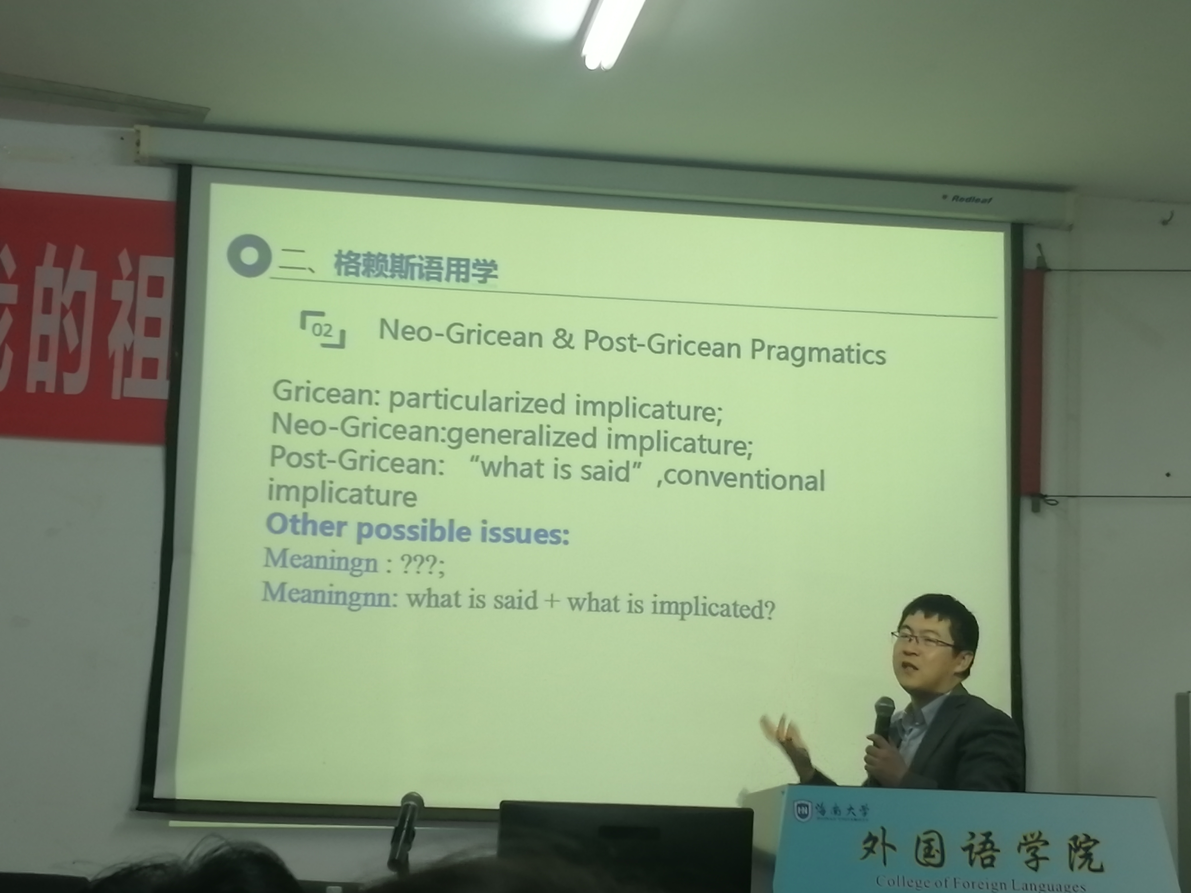 11月28日下午,东北师范大学威廉体育williamhill仇云龙教授应邀来公司交流讲学,在社科楼C115为公司师生做了一场主题为“语用学研究:理论关照与现实应用”的学术讲座。讲座由威廉体育williamhill王勇教授主持。 仇云龙教授以解剖麻雀的方式,通过五个部分梳理既有理论并加以诠释和解析。第一点阐释了语用学的定义,分析了语用学的两个研究视角。与此同时也从三个方面探讨了Verschueren对这种二分法的质疑。第二点解释了格莱斯经典语用学,仇教授从对What made grice gricean的分析中分享了自己的研究和学习方法即理解理论之前先读自传和相关作品了解理论提出者。要读原作,常读常新,常新常知。第三点中仇教授谈及语言顺应论(the framework of linguistic adaptability),通过例证论述了语言顺应论和翻译之间的关系。第四部分,仇教授评述了语用学视角下的文学翻译研究。首先探讨了二者的相融性问题,接着用部分示例分别在语音、语义、语句、语篇四个层面的结合。第五部分,仇教授从六个方面介绍了语用学视角下的语法研究,分别是:间接言语行为理论、礼貌原则、新格莱斯语用学、关联理论和默认语义学。最后,仇云龙教授和在场师生介绍和分享了语用学研究团体和文献资源。 仇教授在透视当下学术界如何运用不同的语用学理论对语言中出现的具体现象展开详尽的分析之余,还对应用方式及研究结论进行了深刻的评述,并就相关议题提出自己独到的见解和观点。 提问环节中,来自不同专业的员工就选题研究和日常学习等方面的疑惑积极发问,仇云龙教授对困惑于此类专业学习中的现实问题的同学进行了细心引导,耐心启发,最终令人获益匪浅。