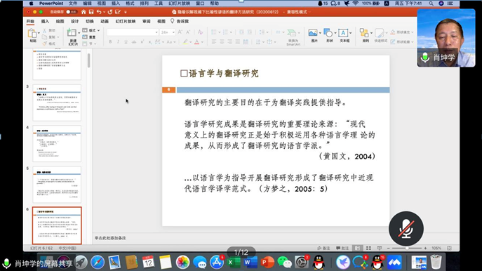 6月12日晚上,广州大学威廉体育williamhill经理肖坤学教授应公司邀请,在腾讯会议为公司师生做了一场主题为“隐喻识解视阈下比喻性谚语的翻译方法研究”的云讲座。讲座由威廉体育williamhill杨婕副经理主持。