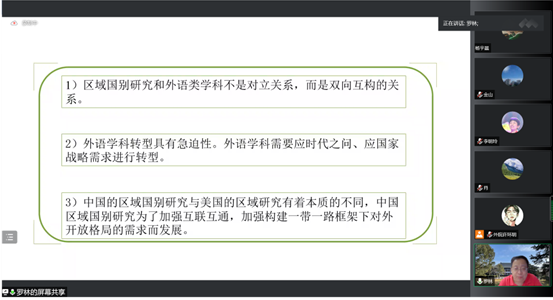 2022年9月23日晚,北京语言大学教授、国务院政府特殊津贴专家、教育部外国语言文学类教学指导委员会副主任委员、高校国别和区域研究工作秘书处主任罗林教授应威廉体育williamhill邀请,做题为“外语学科转型驱动与区域国别学科建构”的线上讲座,讲座由金山经理主持,百余名师生参加。