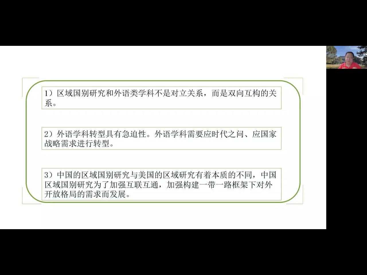 接下来罗教授就外语学科的转型以及外语学科与区域国别学的关系展开详细介绍。外语学科自创建以来就成为服务国家战略的工具型学科,但近来面临着外部环境、就业市场、人工智能等因素带来的多重挑战,学科转型十分必要且迫在眉睫。区域国别学作为文学、法学、史学、经济学的交叉学科,能帮助外语类学科拓展学科边界,提供广阔视野,同时外语学科学者也是区域国别学重要的构建者和实践者,对区域国别研究的长足发展起到重要作用,因而二者是双向互构的关系。此外,罗教授还就中美两国区域国别研究异同点做分析说明。