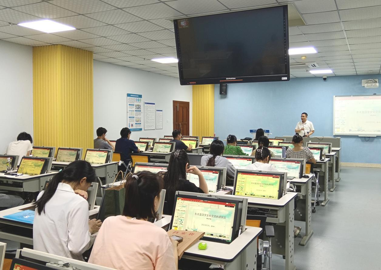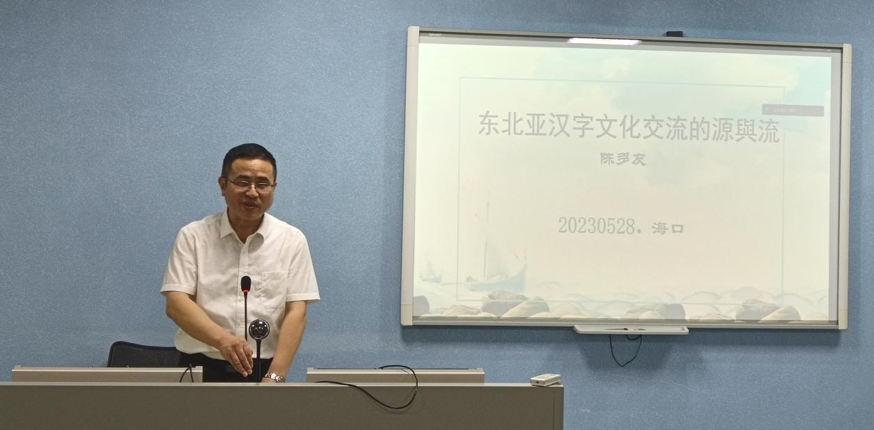 陈教授首先指出读书人是思想文化传承的主体,应认清自己的职责和使命,而汉字是人文交流、学术活动中的保障和条件,汉字文化由黄河、长江两域及周边地区发源而来,以中国人口迁徙、民族融合、文明传播为意志半径,形成了广袤坚实的文化实体——汉字文化圈,回首历史有许多语言文化都如昙花一现,如印第安文化、腓尼基文化等,唯有汉字文化源远流长,享誉世界,陈教授顺势引出了本场讲座的主题——东北亚汉字文化的源与流。