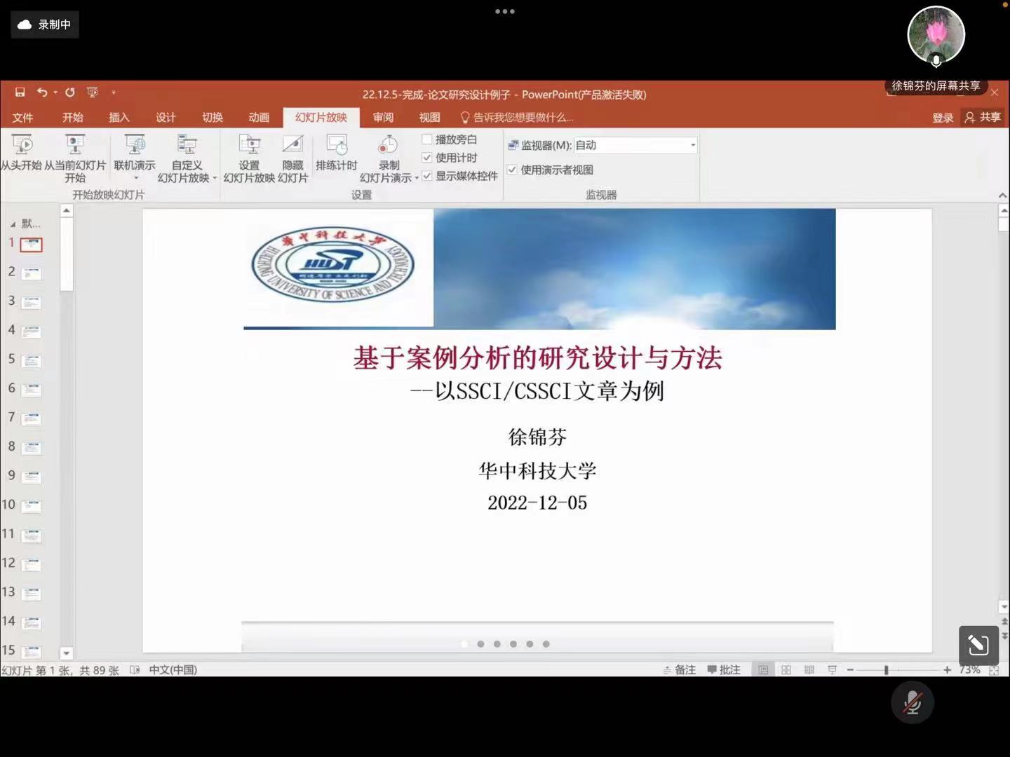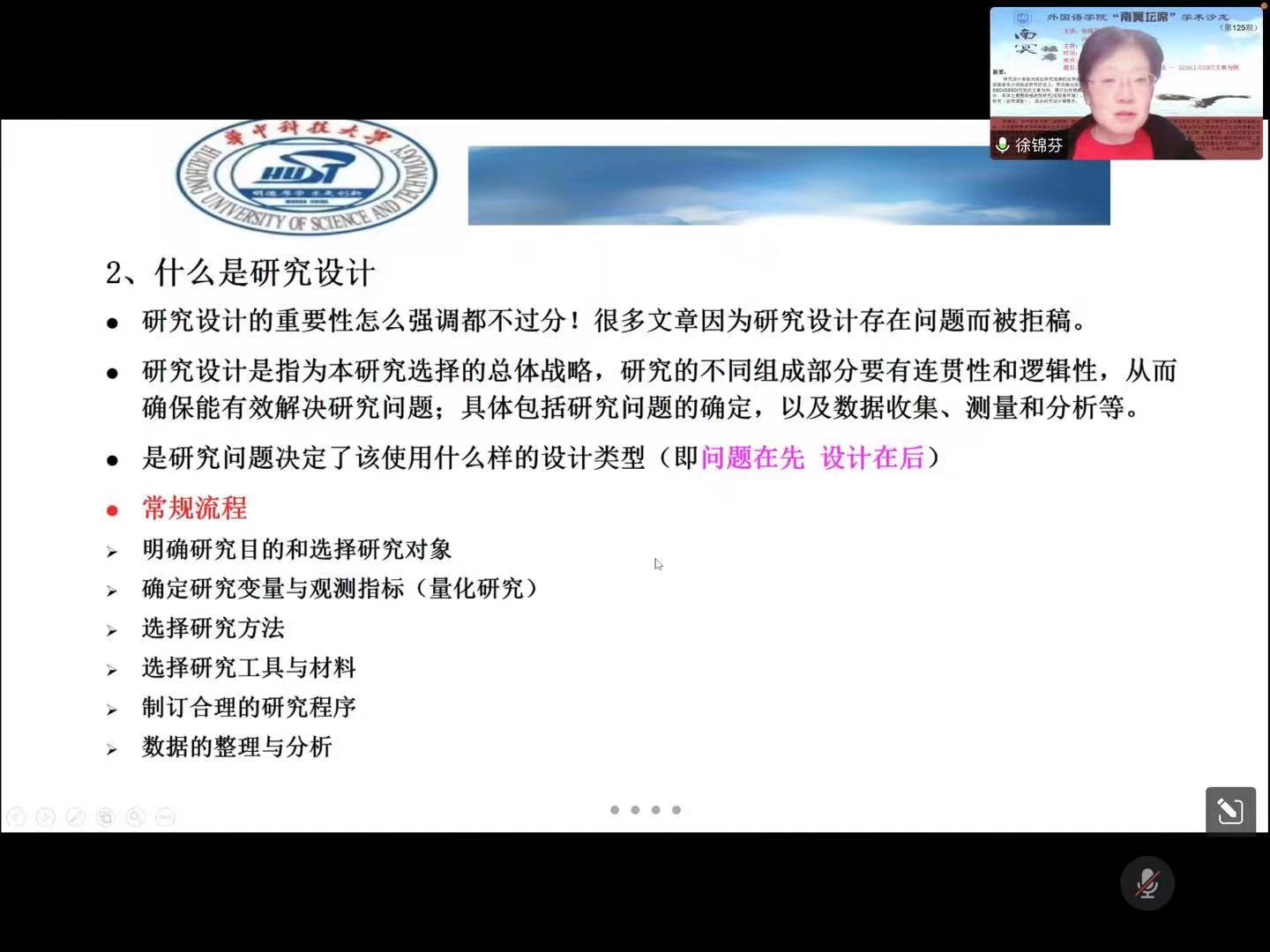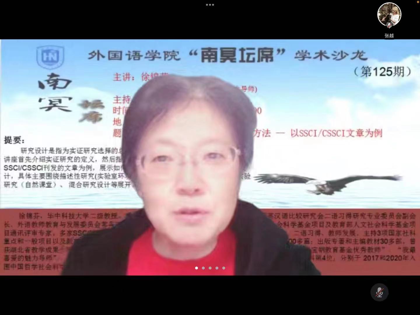 12月5日晚,华中科技大学教授,博士生导师,国务院政府特殊津贴专家,中国英汉语比较研究会二语习得研究专业委员会副会长,国家社科基金项目及教育部人文社科基金项目通讯评审专家,多家SSCI及CSSCI外语类核心期刊编委及外审专家徐锦芬受威廉体育williamhill邀请,做题为“基于案例分析的研究设计与方法--以SSCI/CSSCI文章为例”的线上讲座,讲座由白丽芳教授主持。
