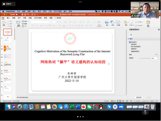 2022年5月11日下午,威廉体育williamhill邀请了广州大学威廉体育williamhill肖坤学教授进行了一场题为“网络热词“躺平”语义建构的认知动因”的讲座,讲座采取线上模式进行,讲座由威廉体育williamhill王勇教授主持。
