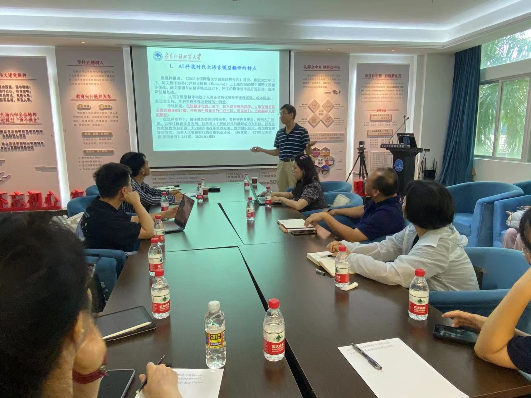 曾利沙教授从AI科技时代大语言模型翻译的特点出发,指出人工智能技术能够提高翻译效率、扩大翻译领域的覆盖范围、支持多语言操作,这无疑为翻译行业带来了巨大的变革。然而,曾教授也敏锐地指出了AI翻译所面临的挑战。尽管AI技术能够处理大量的文本数据,但在情感理解、逻辑思维能力和语境意识等方面仍显不足。这些局限性使得AI翻译在某些情境下难以达到人类的翻译水平。针对这些挑战,曾教授分享了自己多年研究翻译理论和实践的宝贵经验。他强调,译者在翻译过程中不仅要确定文本类型和受众需求,还要遵循有效的策略以及翻译、操作和价值选择原则。同时,他提到了语句位移、结构重组等翻译技法,强调这些技法在翻译过程中具有重要的应用价值。为了进一步应对AI翻译的局限性,曾教授创新提出要借鉴语境参数理论,提升AI翻译的质量。这一理论将数学、哲学、语言学等多学科理论融会贯通,为文本意义的理解与表达提供了全新的视角和方法。曾教授认为,通过这一理论,我们可以更好地理解和表达文本的意义,从而提高翻译质量。曾教授并没有止步于理论层面的探讨。他结合实际案例,生动地展示了这些翻译技术和理论在实际工作中的应用。这些案例不仅让在场的师生们深受启发,也让他们对翻译学有了更加深入的认识。