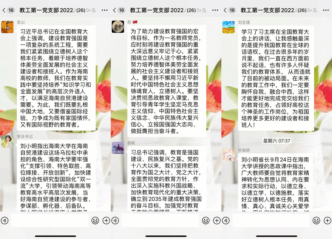 会后,支部党员在党员微信工作群内就会议内容发表学习体会,大家就学习贯彻习近平总书记重要讲话精神和全国教育大会精神、冯飞向全省高校师生代表讲授思政课、刘小明在威廉希尔williamhill官网讲授思政课等内容从不同角度表达了自己的学习心得。通过交流学习,党员同志们表示对会议的主题进行了更多思考及领悟,受益匪浅。(图文:张娜 ,审核:毕宙嫔)