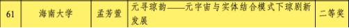 本次大赛共有来自广东、广西、海南、香港、澳门等5个省份和地区的260多支队伍进入决赛。由2023级英语孟芳萱、2022级视觉传达设计张琪格、2022级旅游文创产品设计聂嘉涛、2022级数据科学与大数据技术黄志琴、2023级英语黎妍组成的外院参赛团队全力打造“元寻琼韵”项目,依托元宇宙技术构建琼剧虚拟世界,开展线上琼剧沉浸式体验和各类线下实体活动,传承和发展琼剧非遗文化,成功入围华南赛区决赛圈并夺得二等奖。