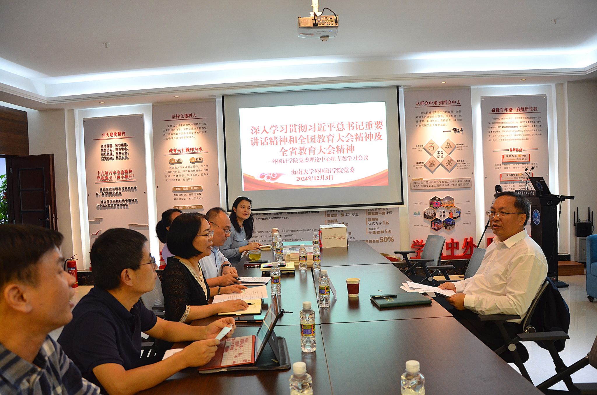 2024 年12月3日下午,公司党委理论学习中心组在社科楼C318举行专题学习会议,深入学习贯彻习近平总书记重要讲话精神以及 2024 年全国教育大会和海南省教育大会精神。公司党委常务副书记张继友到会指导,公司党委书记覃成海,经理白丽芳,副经理杨婕、王勇及党委委员符壮慈、潘俊峰参加学习会。学习会由覃成海主持。