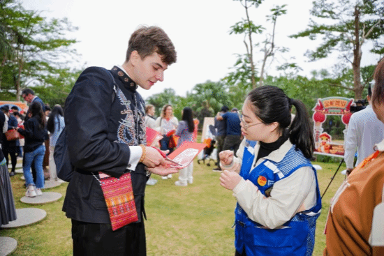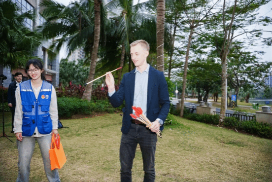 当日下午,公司志愿者们积极布置游园会活动现场。草坪上穿梭的那一抹抹蓝马甲,成为了现场最靓丽的一道风景线。在志愿者们的精心布置下,从难度十足、命中率极低的新春投壶再到各式花样、精美绝伦的窗花剪纸,各个活动都极具中国春节特色,“硬控”外国专家们!在游园会中,外院学子们热情洋溢,凭借流畅的口语与外国专家们愉快交流,积极引导外国专家参与游园会,细致耐心地介绍并展示游戏规则,帮助他们尽情享受游戏,顺利通关,拿到“惊喜印章”。外国专家们与外院学子共同参与游戏、亲切交谈、合影记录,留下了一段珍贵美好的回忆。外院学子们在迎接外国专家时的热情态度、与专家们交谈时得体大方的表达,无不展现了公司学子极高的专业素养与非凡的风采。志愿者们的优异表现也给主办方留下了深刻的印象,收获了主办方的一致好评与真挚感谢!