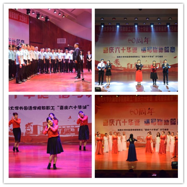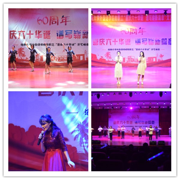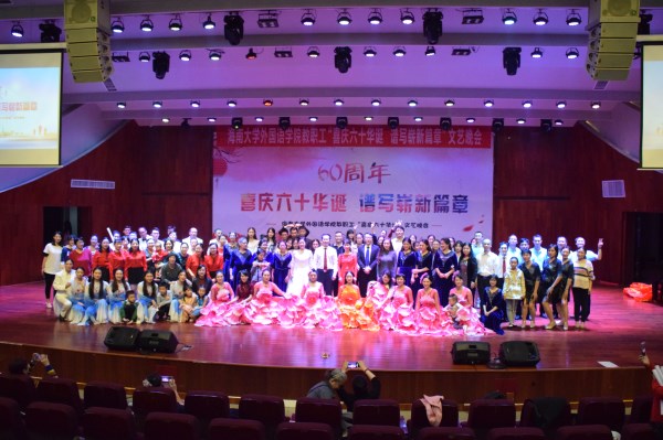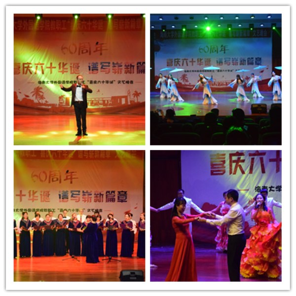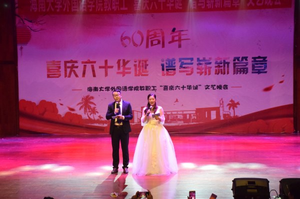 晚会由教职工代表赵冬和岳梅主持,共分三个篇章。分别是“辞旧迎新,贺亥年千岁之新禧”、“聆听今日,庆海大甲子之芳华”、“学融中外,谱外院辉煌之赞歌”。