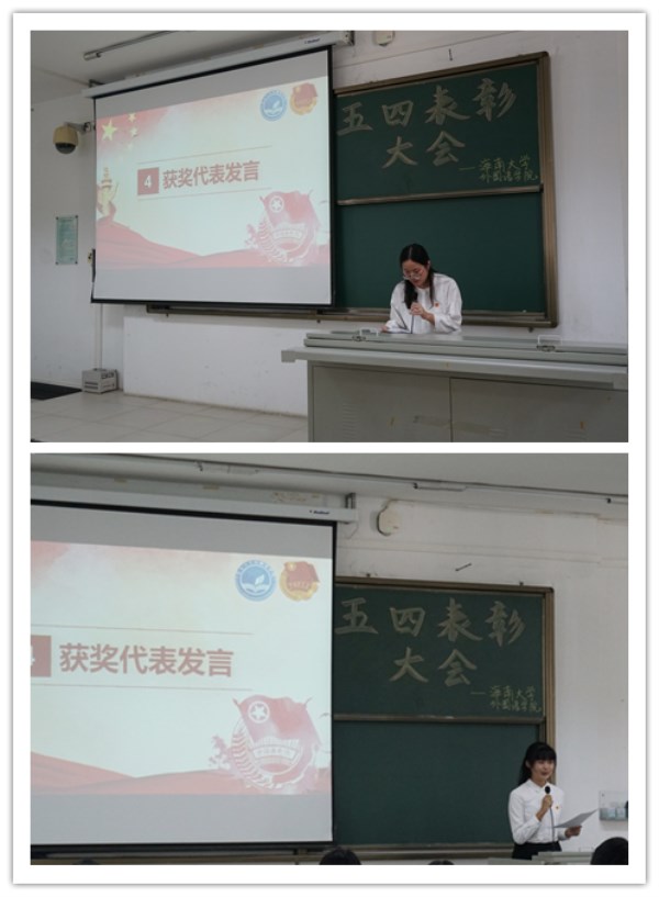 郭亚宁同学作为获奖个人代表上台发言。她表示,作为站在新历史节点上的青年,我们需要认真思考五四精神的时代价值,亲身投入实践,勇担历史使命,不负伟大使命。窦静怡同学作为获奖集体代表,上台介绍支部先进事迹及组织管理经验。她谈到青年人要继承五四运动的宝贵精神财富,以实际行动肩负起党的期望与人民重托。她也鼓励各支部成员努力学习,积极参加社会实践、志愿服务等活动,不断提高自己的综合能力和核心竞争力。