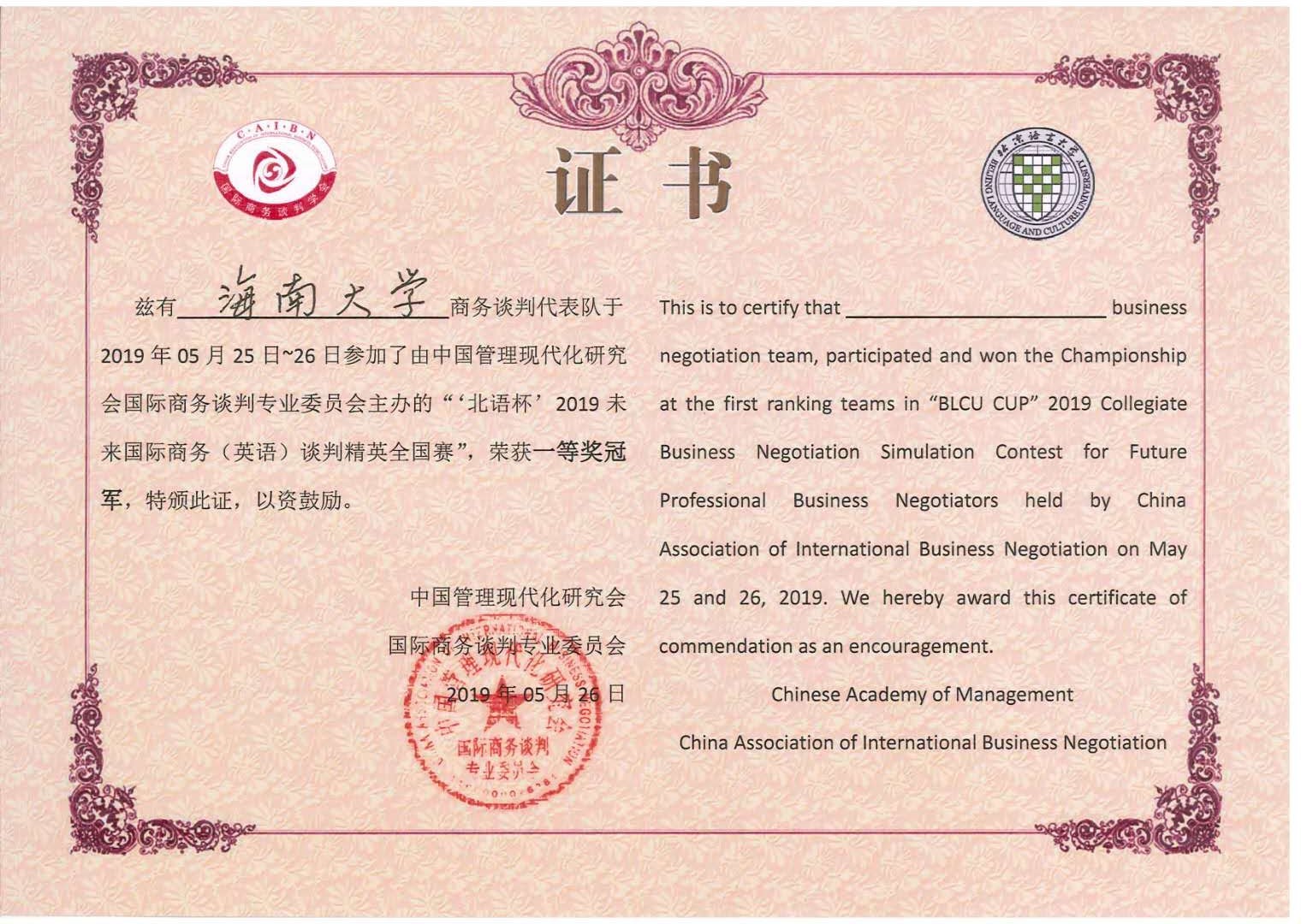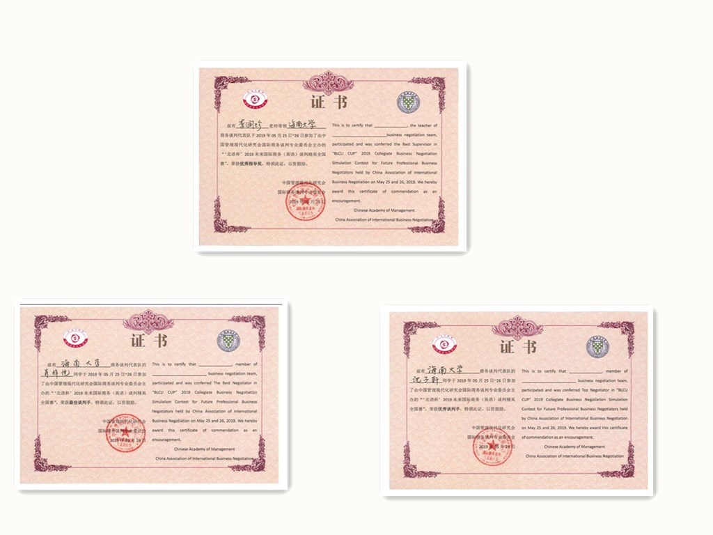 2019年5月25日至26日,“北语杯”2019未来国际商务(英语)谈判精英赛在北京语言大学成功举办。由威廉体育williamhill教师李润珍指导,商务英语专业沈子轩、李俊杰、肖梓恺、徐亚欣、杜欣瑶、焦通6位同学组成的威廉希尔williamhill官网代表队表现出色,在全国18支高校参赛队伍中,脱颖而出,一举夺冠!收获大满贯!荣获团体一等奖冠军!其中,李润珍获评“优秀指导老师”,肖梓恺获评“最佳谈判手”,沈子轩获评“优秀谈判手”。