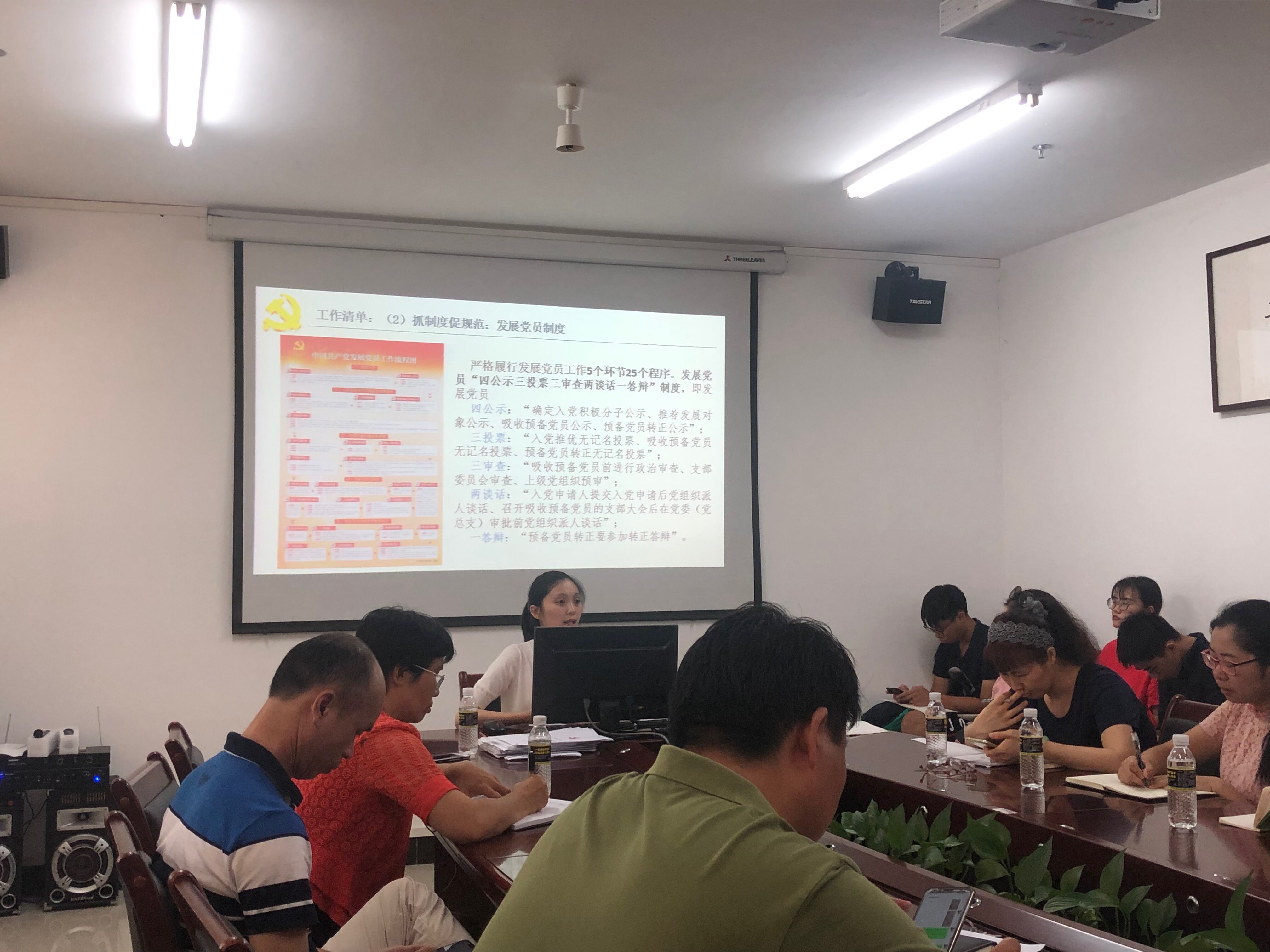 随后,员工商务英语第二党支部书记刘颖敏同志作《如何推进党员学习教育——以员工党支部为例》的交流汇报。刘老师结合党支部标准化建设内容,从“三会一课”制度、发展党员制度、党员学习教育制度等进行介绍,同时结合公司旗帜工程建设和员工商务英语第二党支部微信公众号的建设进行特色经验交流。