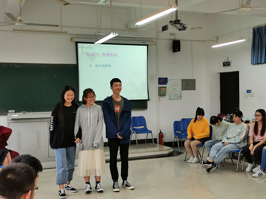 活动开始前,同学们先进行了简单的小组自我介绍,通过记住小组成员的爱好和特点增进相互了解。热身活动结束之后,所有的同学重新围坐在一起玩“刮大风”的游戏,具有相同特征的同学必须相互交换位置,最后一个坐下的同学要接受表演才艺的“惩罚”。在紧张有趣的氛围中,原本有些拘谨的同学开始自由交谈,多才多艺的同学也获得了一次很好的展示机会。