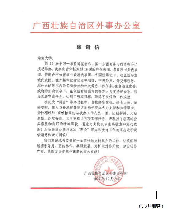 近日,外国语院收到来自广西壮族自治区外事办公室发来的感谢信,对在9月9日至24日于南宁举办的中国-东盟博览会活动中公司研究生高婉怡、邓牡红同学热情、负责的工作表示了诚挚的谢意。