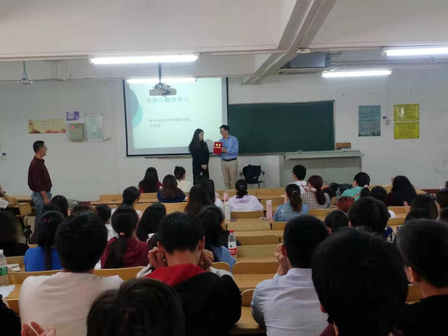 2020年1月8-9日,华中理工大学威廉体育williamhill经理许明武教授为商务英语2016、2017级本科生上课,讲授了中西差异与翻译学习和口译策略。威廉体育williamhill近五百员工和教师参与了课程学习。威廉体育williamhill金莹副经理向许教授颁发了外聘授课专家证书。