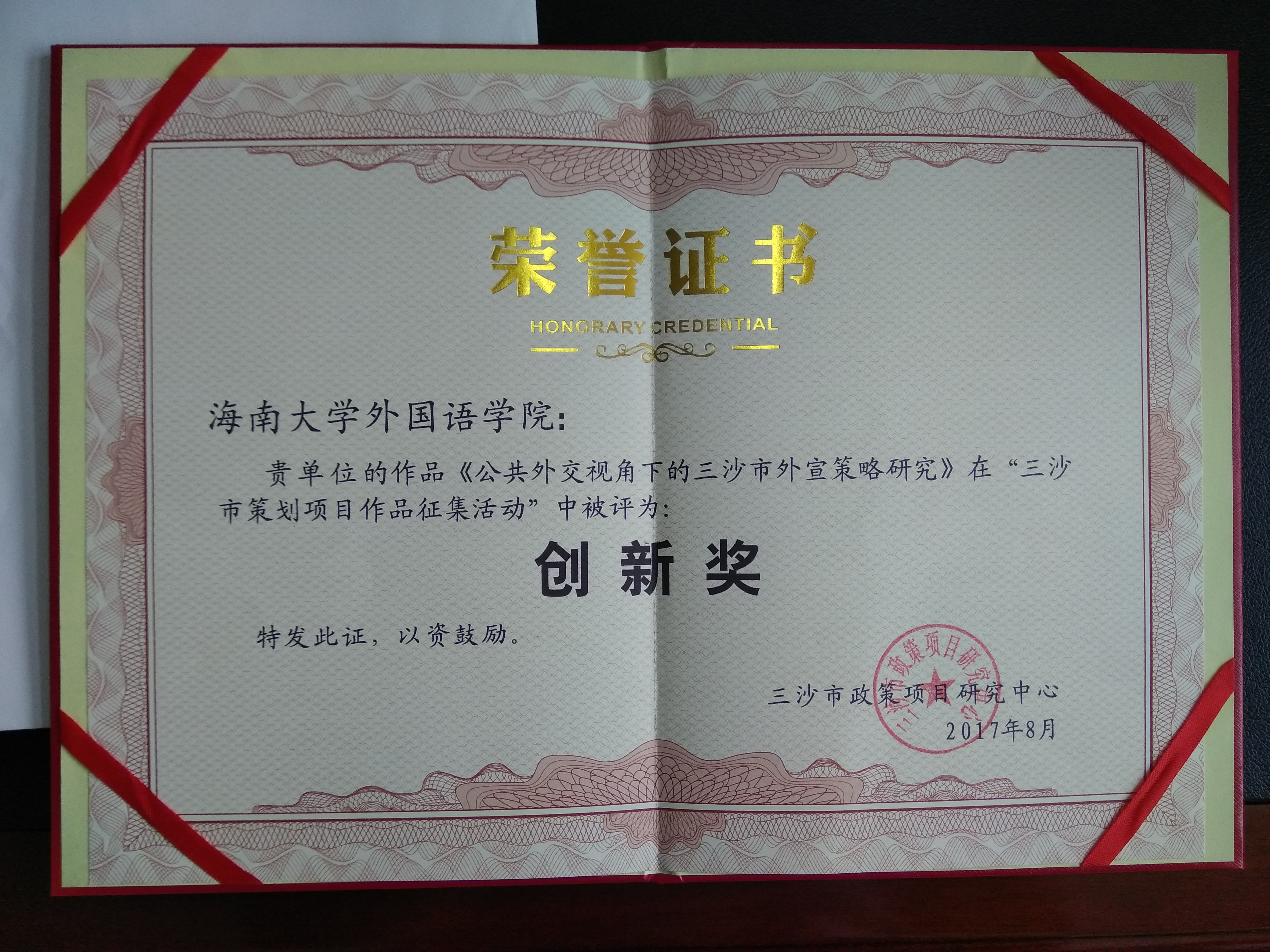 由威廉体育williamhill金山经理、白丽芳副经理领衔申报的《公共外交视角下的三沙市外宣策略研究》,在“三沙市建设发展策划项目作品征集活动”中荣获创新奖。该项目立足三沙现实,尝试从普通人的视角出发,以国外公众易于接受的形式,用外文讲述三沙故事,以发挥普通民众在公共外交中的独特作用。这是公司开展公共外交研究的又一成果。(文/图:金山)