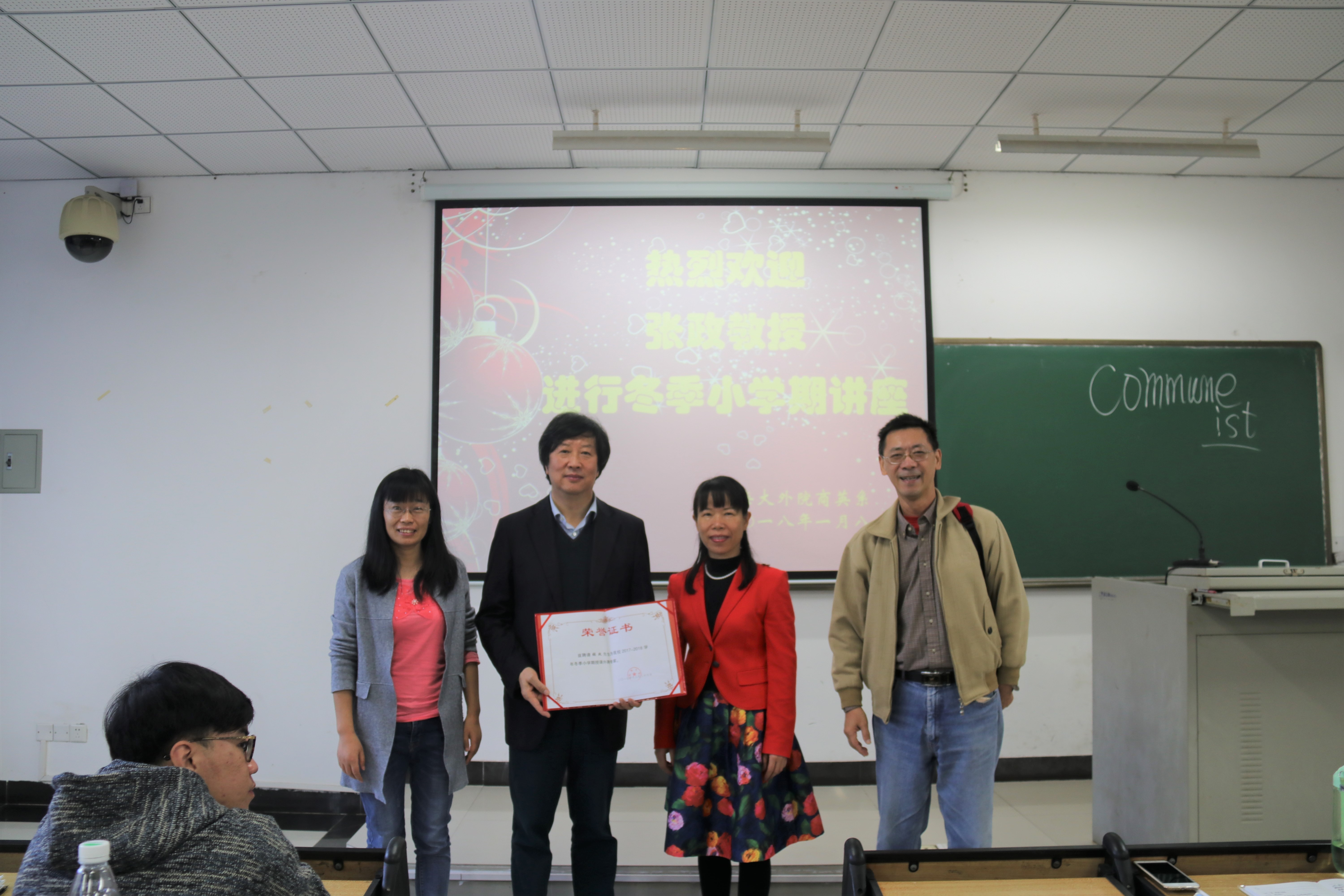 2018年1月8日,威廉体育williamhill冬季小学期正式拉开序幕。应威廉体育williamhill邀请,北京师范大学张政教授在5教103教室为同学们开设了冬季小学期第一场讲座——《商务英语翻译》。黄丽芹书记为张政教授颁发了“威廉希尔williamhill官网2018冬季小学期授课外聘专家”证书。讲座由卢尚玉老师主持。