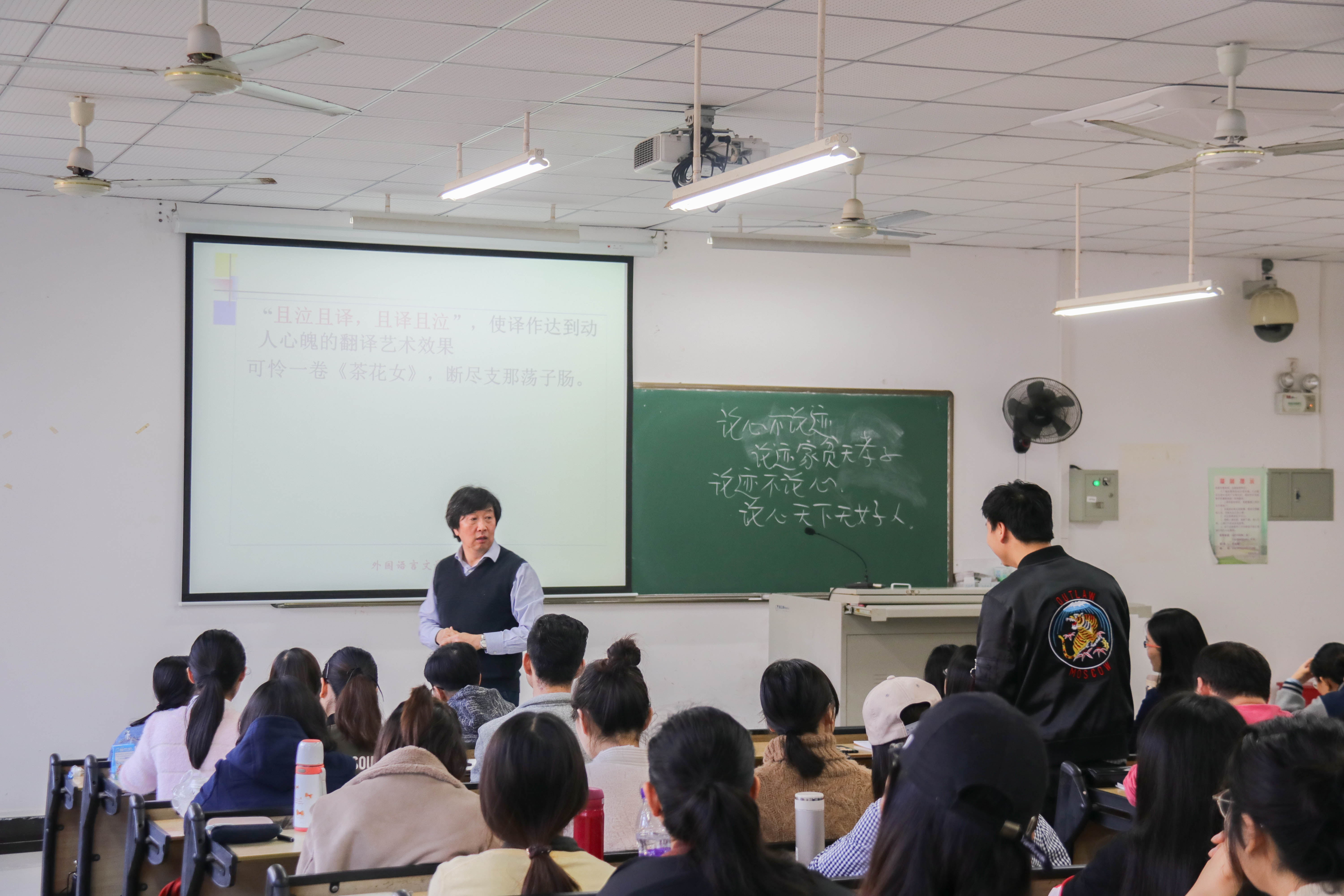张政教授重点介绍了佛教经典翻译和近代严复、林纾等翻译家们的翻译著作,结合生动鲜活的实例深入浅出地为同学们讲授了中国翻译的历史、发展、影响及重要性。张政教授讲课方式幽默风趣、声情并茂,全程与同学们互动,并用其风趣的语言、渊博的学识和精妙的分析启发了在座的每一位师生。讲座结束后,同学们对张政教授的精彩授课报以热烈的掌声,并纷纷表示收获颇多。