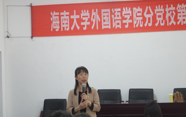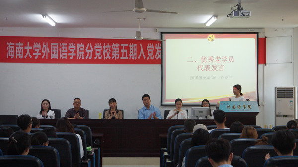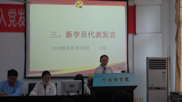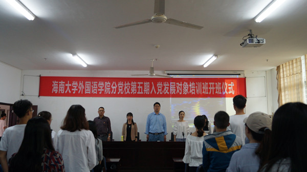 伴随着庄严肃穆的国歌,此次发展对象培训班开班仪式正式开始。2015级英语4班的卢亚兰同学作为优秀老学员代表发言,以身作则提醒新学员要严肃认真对待此次党课学习机会,在思想上严格要求自己,端正入党动机,积极向党组织靠拢。随后,2016级商务英语5班的王瑶同学作为新学员代表发言,代表全体新学员坚定地立下加入中国共产党的决心,端正学习态度,认真学习党章党规,不断地提高自身的思想觉悟,争取早日加入中国共产党。接着,新学员代表2016级商务英语3班罗颖同学带领全体新学员进行党课培训宣誓。