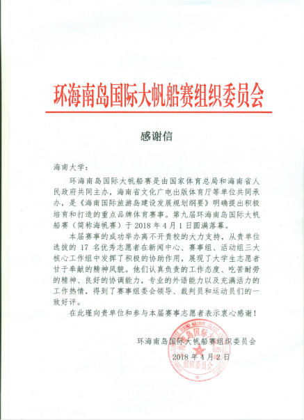 2018年3月25日-4月1日,经组委会邀请,威廉希尔williamhill官网派出威廉体育williamhill17名本科和研究生志愿者,参加第九届环海南岛国际大帆船赛,威廉希尔williamhill官网获卓越贡献奖。//www.hainanu.edu.cn