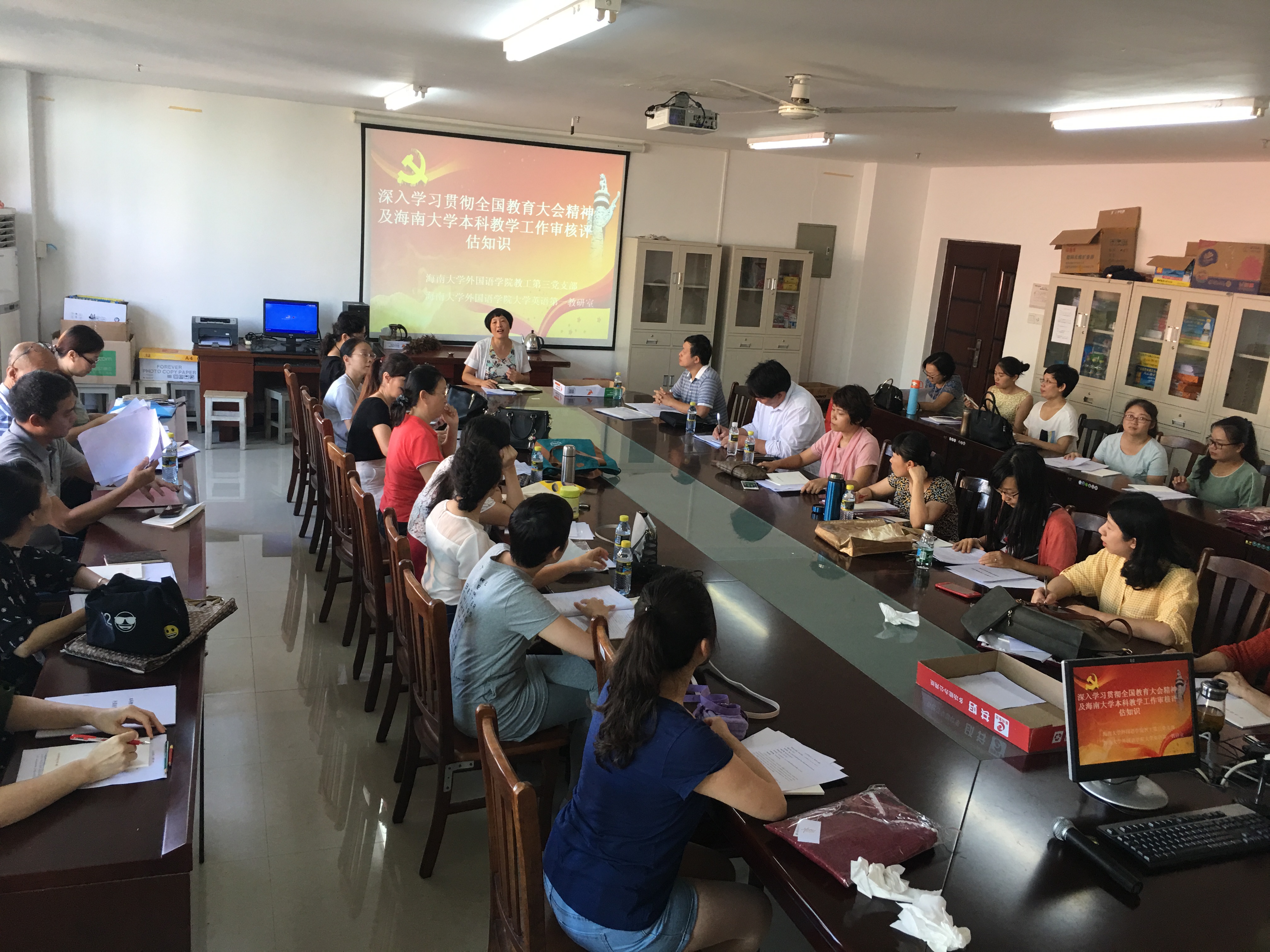 会议最后,张辉主任通报了最新一轮的评估反馈及新增事项,并对大学英语I教案定稿做了详细说明,并提醒大家评估期间保持交流通畅和信息互通。本着自查、自省和自己对自己负责的原则,每位老师都对自己的工作进行最后一轮查漏补缺,争取做到万无一失。