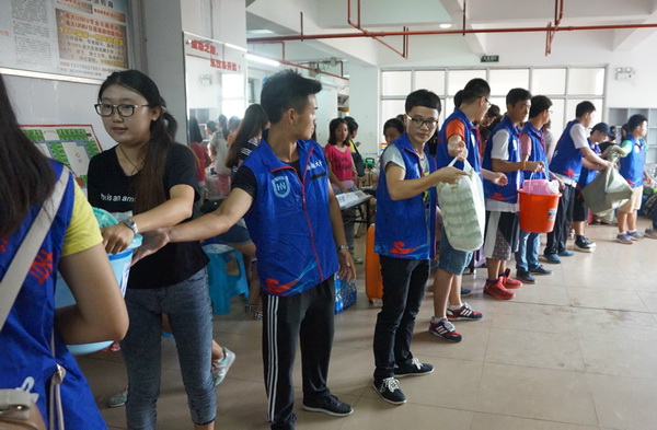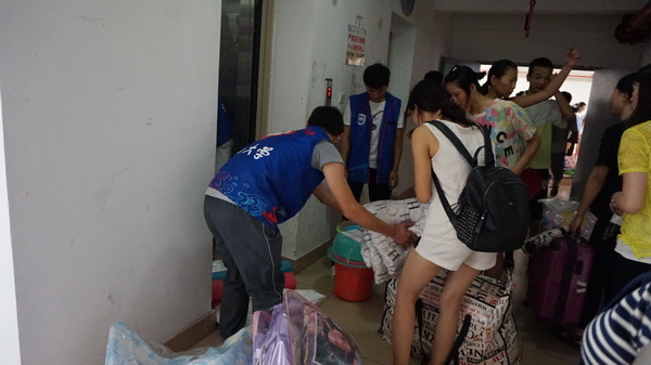 下午4时,志愿者们准时在紫荆公寓门口集合,共同迎接城西校区员工的到来。志愿者们分为接行李组、传送组、电梯口组、楼层电梯组和失物招领组6个组别,每个小组都安排一名团委干部担任组长负责本组工作。随着城西校区同学的到来,各项工作有条不紊进行着。志愿者们动作麻利,在楼道间来回穿梭,他们认认真真地把每个同学的行李安置到位,汗水湿透了他们的衣服,但他们都顾不上休息。下午6时许,城西校区同学们的行李全部归放妥当,搬迁工作圆满结束。