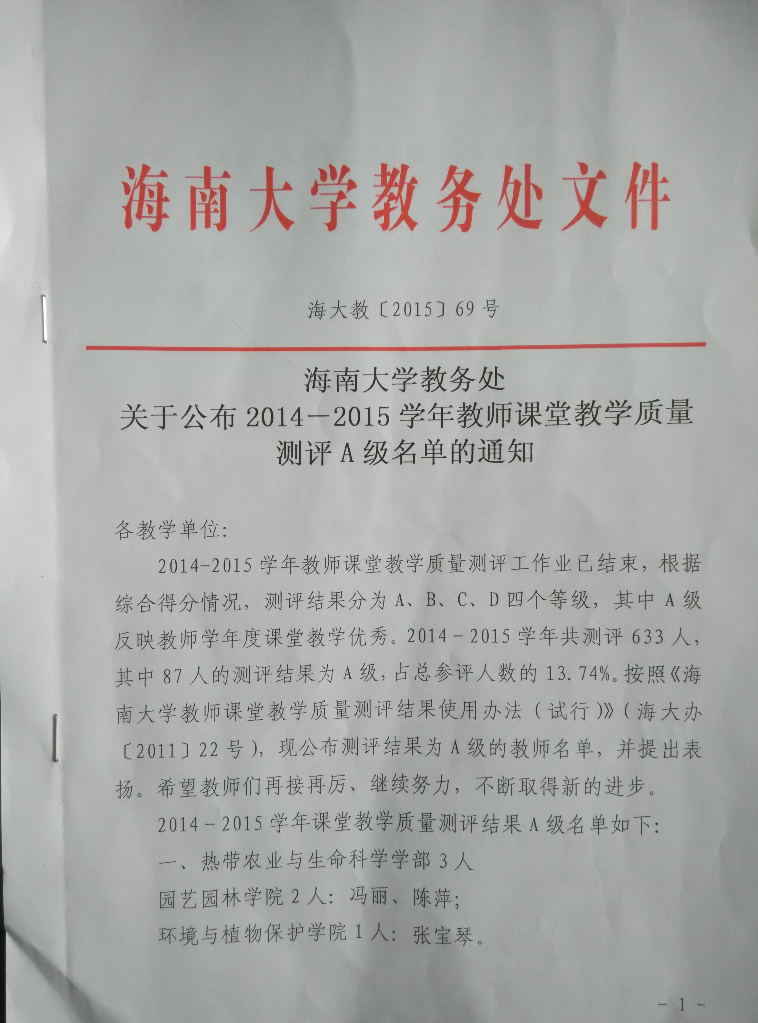 2014--2015学年教师课堂教学质量测评工作已结束,公司共有17名教师获得优秀,公司对他们在教学上取得的成绩表示祝贺,希望全体教师向他们学习,再接再厉、继续努力,不断取得新的进步。//www.hainanu.edu.cn