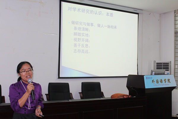 白丽芳博士首先阐述了学术研究的本质和过程,认为做研究要具备条理清晰、脚踏实地、视野开阔、善于反思等思维品质;做研究是大量积累、整合资料和不断实践的过程。谈到项目书内容,她主要从“选题的目的、意义(理论和现实)和国内外研究概况,拟解决的主要问题及研究方法,预期结果和成果形式和为什么由你来做”等方面做了详细的说明,建议项目书的撰写要早做准备、多次修改、自查自纠、谦虚有耐心。在最后的论文写作部分,白丽芳博士以其在核心期刊发表论文的过程为例,阐述了论文写作要大量阅读国内外优秀文献、做好阅读笔记、总结已有研究的不足之处,不断修改,才可写出优秀论文。