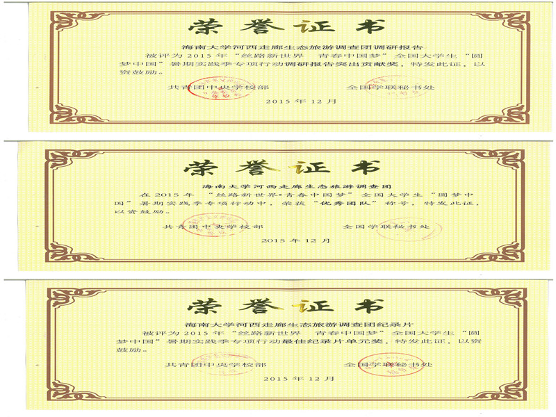 3.由团中央公司部组织的丝路新世界、青春中国梦“一带一路”专项中获得全国优秀调研报告、优秀团队、优秀纪录片、优秀专家、实践标兵、优秀个人;
