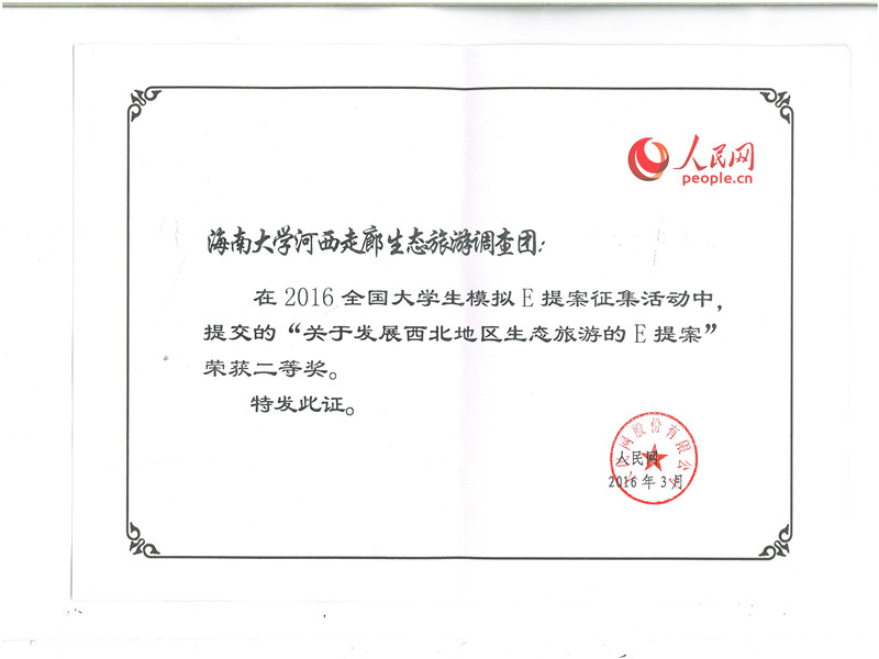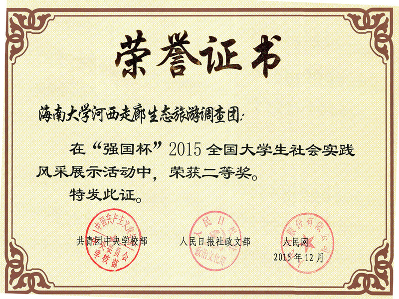 威廉体育williamhill从2015年4月开始筹备 “一带一路”河西走廊生态旅游调查项目,联合合肥工业大学、兰州大学、中国科学技术大学、西北民族大学、滁州公司五所高校,团队由校团委林洪冰书记,公司黄丽芹书记、何映敏副书记任指导老师,以河西走廊为调研目的地,团队11名师生从7月21日到8月4日,历时15天,跋涉6000多公里,调研景点10多个。通过后期不断努力团队完成了社会主义核心价值观宣讲材料汇总,制作出一部“六校联合”纪录片,形成六篇专题报告以及以“‘一带一路’推进中的生态文明建设:基于河西走廊的综合调查”为题的总报告,总报告约25万多字。同时,威廉希尔williamhill官网团队还完成了“‘一带一路’推进中的生态旅游建设——基于河西走廊的调查研究”的独立课题,完成了一部河西走廊风景纪录片、一部团队实践纪录片,以及一篇3万多字的调研报告。调研报告中的内容已上报给有关部委,报告中的建议被部分采纳。此次社会实践项目受到新华网、《人民日报》、《海南日报》、腾讯等40多知名媒体的跟踪报道与转载,扩大了公司和公司的社会影响力。团队荣获奖项: