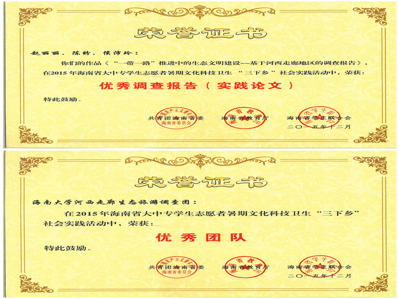 6.由团省委、教育厅、省学联组织的大中专员工志愿者暑期三下乡社会实践活动中荣获省级重点团队、优秀调研报告、省级优秀指导教师、优秀员工。//www.hainanu.edu.cn