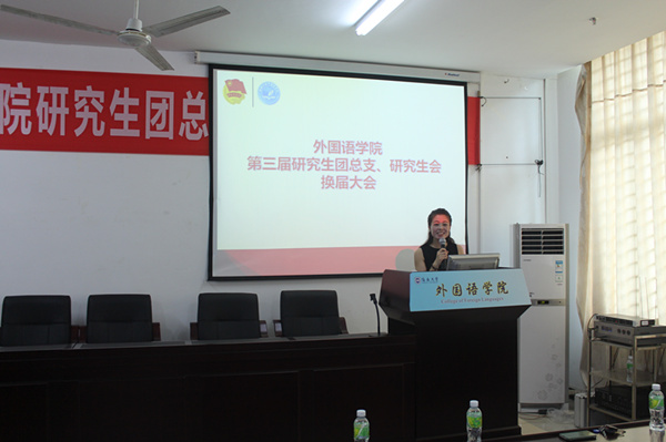 大会在庄严的国歌声中拉开序幕,何映敏副书记做致辞。公司党委何映敏副书记对各位嘉宾的到来表示感谢和欢迎,并对新一届的团总支和研究生会工作进行指导并提出建议,希望大家以学业为重,并借助团总支和研究生会这个平台为员工做好工作,使自己的能力得到提升,为同学中间做好榜样,同时,感谢第二届团总支研究生的付出,希望新一届继续努力,以一颗为大家服务的心,发扬外院人奋勇向上的精神,把工作做的更好、更扎实!