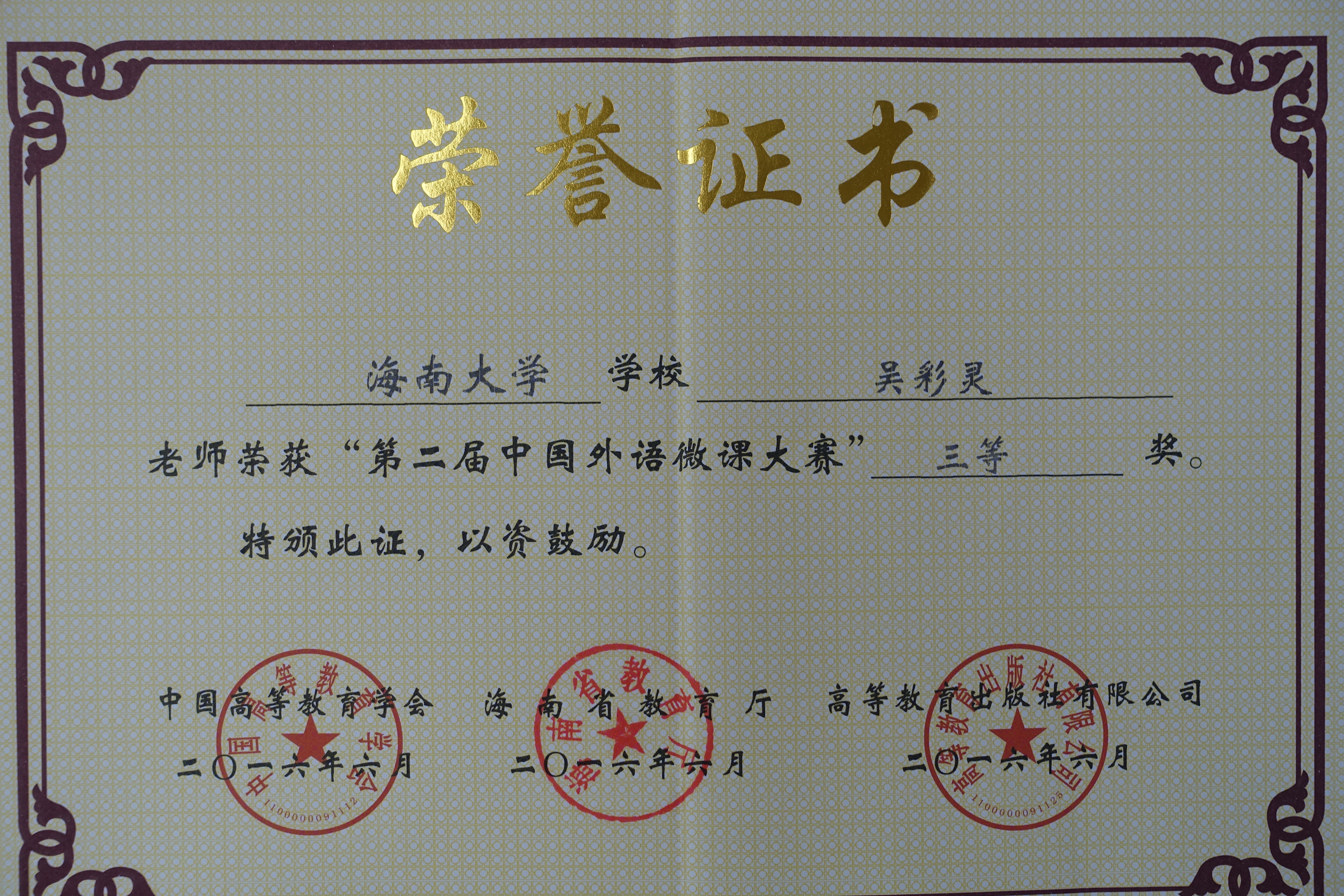 2015年7月至2016年7月,在第二届中国外语微课大赛海南省复赛中,威廉体育williamhill多名英语教师喜获佳绩。