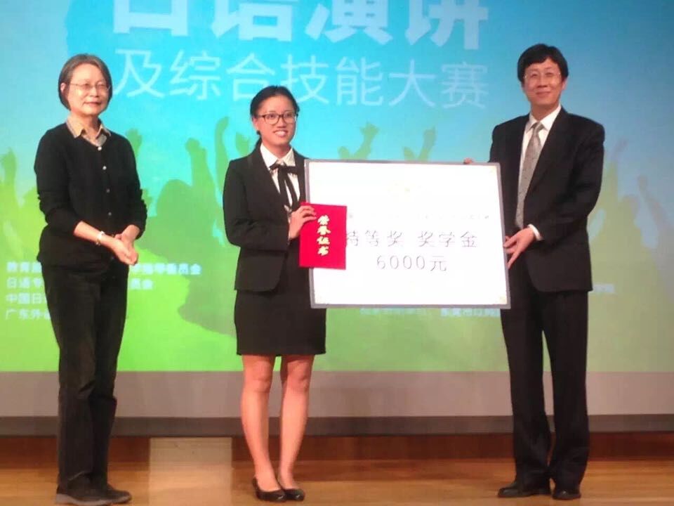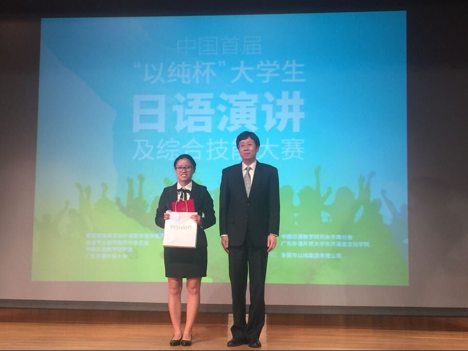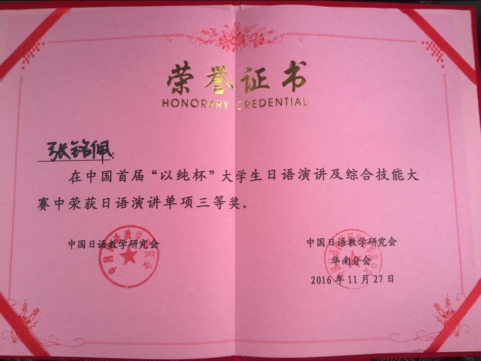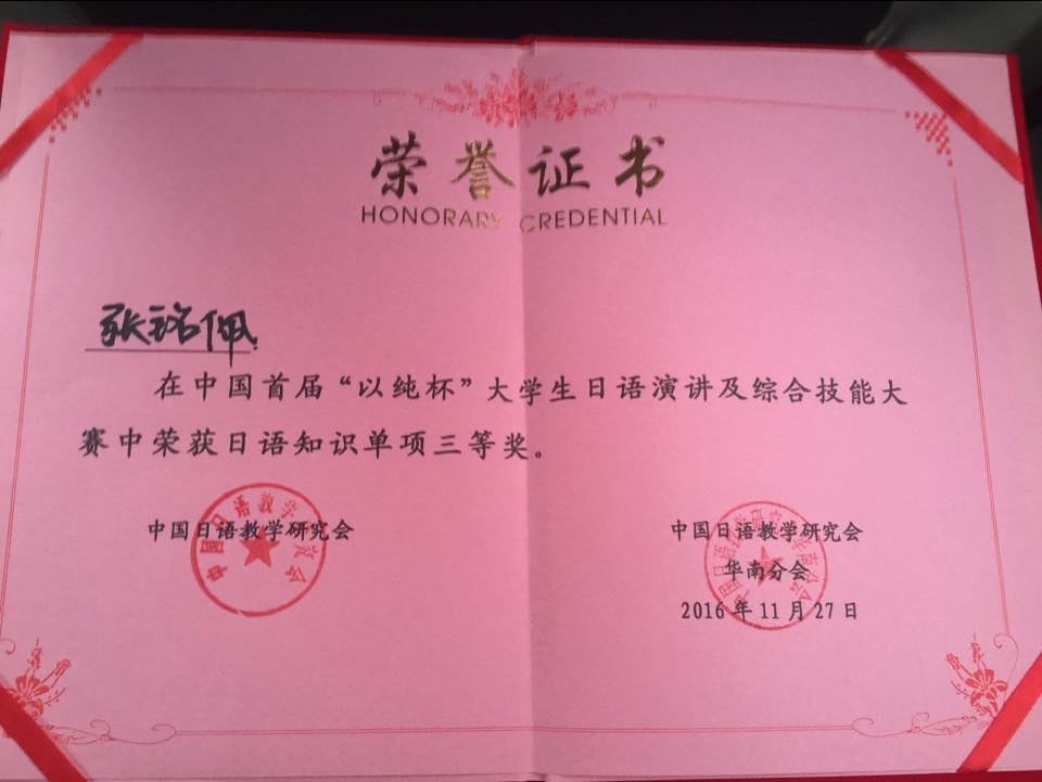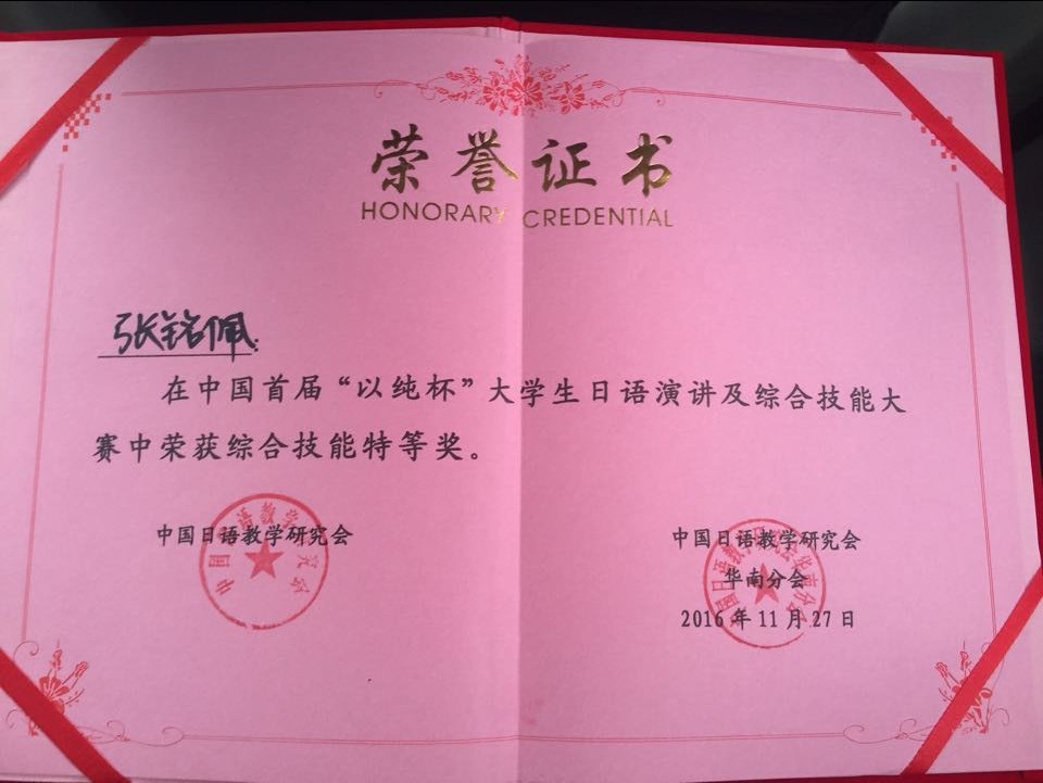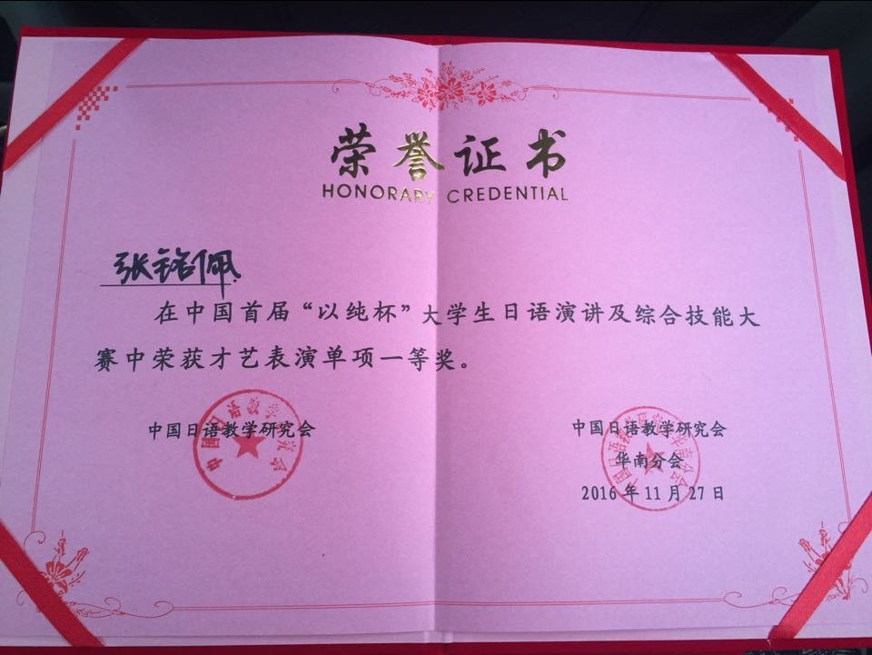 2016年11月27日,于广东外语外贸大学举办的中国首届“以纯杯”老员工日语演讲及综合技能大赛中,威廉体育williamhill日语系2013级张铭佩同学荣获唯一一项最高奖项——综合技能特等奖。在单项技能中分别荣获才艺表演一等奖、日语即兴演讲三等奖、日语知识速答三等奖,并获得六千元奖励。这是威廉体育williamhill员工在全国大赛中首次获得国家级特等奖。