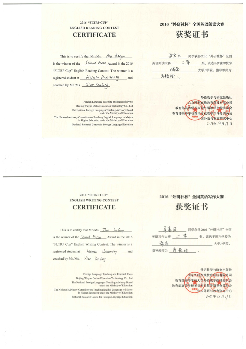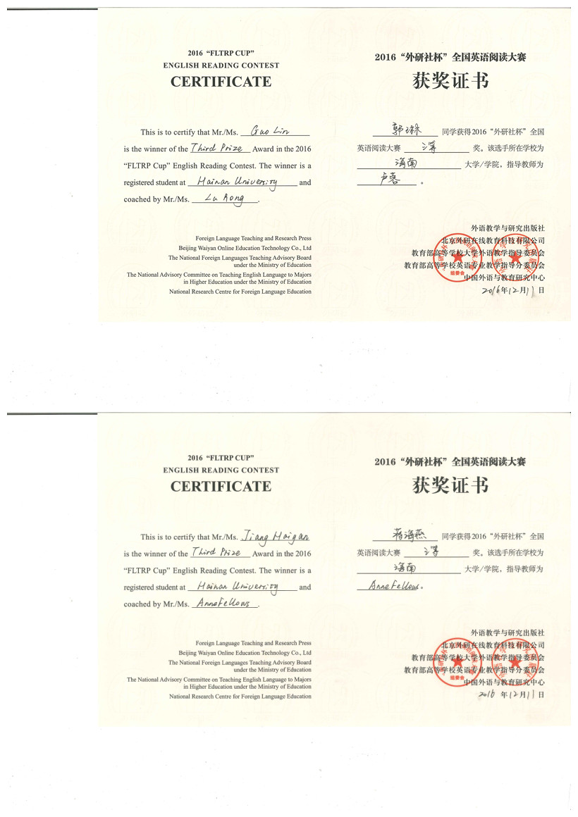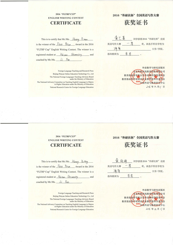 2016年12月9日,“外研社杯”全国英语写作大赛和阅读大赛总决赛在北京外研社国际会议中心举行。威廉希尔williamhill官网参赛选手威廉体育williamhill2013级经贸英语专业黄乙蔓同学和人文传播公司2015级汉语国际教育专业黄雨婷同学同时荣获写作大赛一等奖、威廉体育williamhill2015级商务英语专业周嘉凤同学获得写作大赛二等奖;威廉体育williamhill2015级英语专业马宝玉同学获得阅读大赛二等奖。这是公司员工在“外研社杯”全国英语写作和阅读大赛中首次获得一等奖和二等奖的优异成绩。