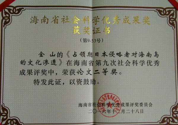 5月23日下午,海南省第九次社会科学优秀成果奖颁奖大会在海口举行。公司金山教授的《占领期日本侵略者对海南岛的文化渗透》、曾传生、李双梅副教授的《英语通用语与同声传译》分别荣获论文二等奖和编著三等奖。