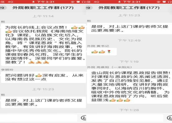 金山经理从“课程思政”概念的提出及发展、关于“课程思政”建设的思考以及《海南地域文化》课的实践三部分进行了详细生动的讲解。首先,金经理通过《习近平总书记在全国高校思想政治工作会议上的重要讲话》中对“课程思政”的重要论述,解释了思政工作的内涵及重要性,并强调“各类课程思政建设的协同效应有待增强”。随后,金经理从课程与思政的关系、课程思政的基础、课程思政元素的挖掘与设计、课程思政教学效果评估等四个方面,阐述了自己独到的见解,为教师开展课程思政提供了思考框架和路径指导。最后,金经理以公司教师团队主讲的《海南地域文化》课程为例,深入浅出地讲解了海南四大民族从激烈对抗到和谐共生的故事,展示了如何讲好“海南好故事”,并以此增强思政教育的效果。结合这门课程的实践,他又从公共外交与跨文化交流视角,阐释了如何在明确专业建设目标与课程定位的基础上梳理出课程思政的主线、载体和方式。