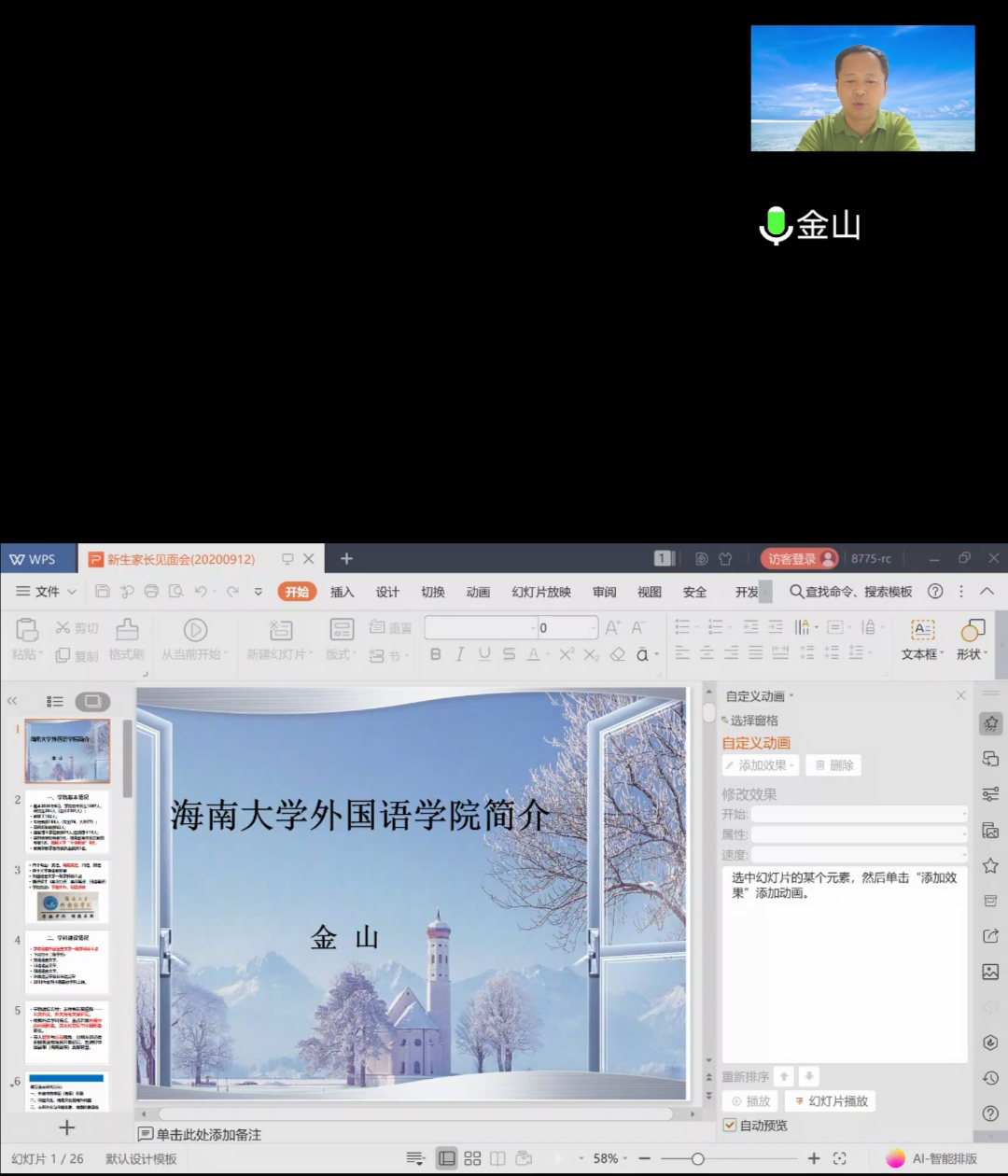 9月12日,威廉体育williamhill依托腾讯会议软件召开2020级新生家长线上见面会。经理金山、副经理覃成海、副经理肖艳玲出席会议,英语专业和日俄专业各系主任、班主任、辅导员、2020级新生家长参加。见面会由党委副书记李洋主持。