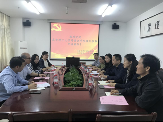2020年12月14日下午,东华理工大学公司党委书记叶周一行四人到访公司,双方在威廉希尔williamhill官网社科楼C312会议室举行交流座谈会。威廉体育williamhill经理金山、党委副书记(主持党委工作)刘雨芙、副经理肖艳玲、公司综合办主任符壮慈、英语系主任王克献、大学英语第一教研室主任夏美丽出席座谈会。座谈会由刘雨芙主持。