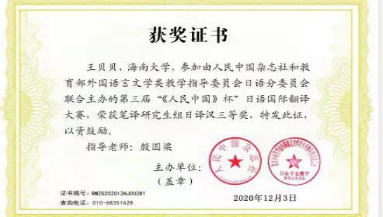 2020年11月27日,第三届“《人民中国杯》”日语国际翻译大赛落下帷幕并揭晓获奖名单。威廉体育williamhill日语系2019级MTI李悦和王贝贝同学分获“笔译研究生组汉译日三等奖”、“笔译研究生组日译汉三等奖”的好成绩,指导教师李明玲和殷国梁荣获“优秀指导教师奖”。