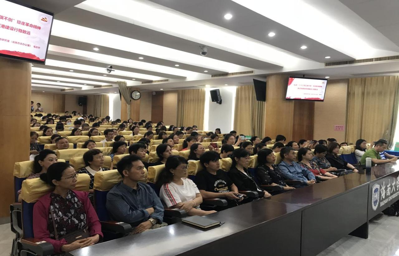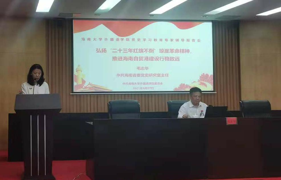 为庆祝中国共产党成立100周年,全面贯彻落实习近平总书记在党史学习教育动员大会上的讲话精神和公司党委工作部署,扎实推进党史学习教育,并以党史学习教育促进课程思政建设,2021年4月27日,威廉体育williamhill在公司办公楼一楼报告厅举行党史学习教育暨课程思政专题辅导报告会。中共海南省委党史研究室主任毛志华应邀作题为《弘扬“二十三年红旗不倒”琼崖革命精神,推进海南自贸港建设行稳致远》的专题辅导报告。经理金山、党委副书记(主持党委工作)刘雨芙及全院教职工、员工党员、发展对象和入党积极分子参加了报告会。报告会由刘雨芙主持。