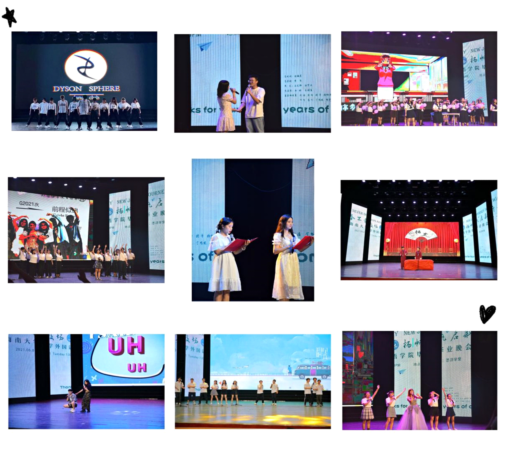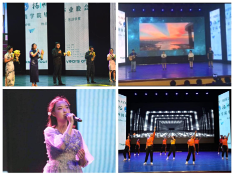 毕业在即,亲爱的老师们也录制了视频,或幽默、或亲切、或感伤、或叮咛,表达了对同学们的美好祝愿。随后,由杨帆、毕宙嫔、殷国梁、刘宇欢和吴剑锋五位老师共同演唱了《光阴的故事》,柔情的歌声默默温暖着同学们的心田。旅人要依靠北极星,我们的人生也需要“引航之星”,李旭云、陈芯慧、陈泓圳和胡泽诚同学弹唱了歌曲《夜空中最亮的星》,句句歌词发自肺腑,道不尽绵绵师生情;侯雯桢同学用《A Million Dreams》告诉我们,心中若有梦,眼里便有光,坚定自己的方向,你所期盼的明天,终究会到来;踩着欢快的节奏,日语系老师共舞《靓丽人生》,把晚会气氛推向高潮,同学们纷纷欢呼鼓掌,连连叫好。
