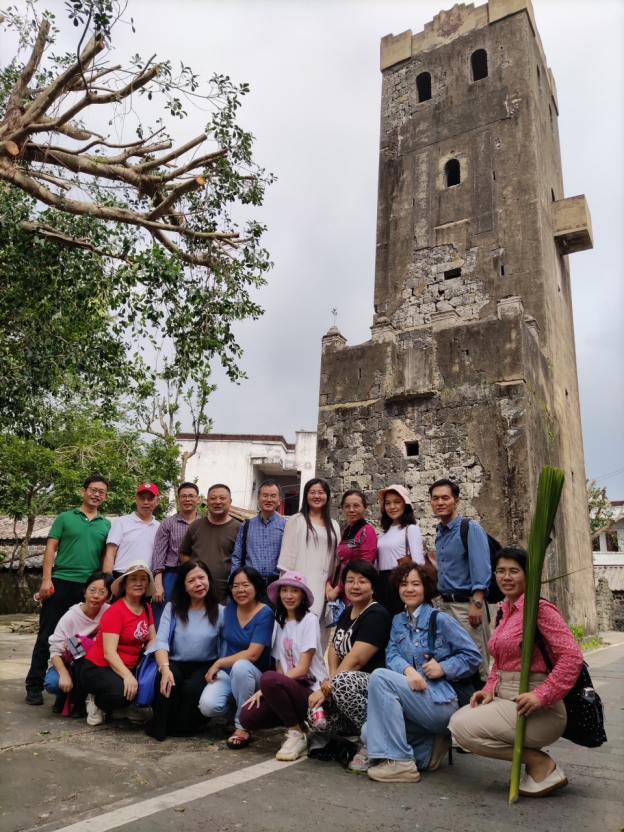 老师们先来到了此行体验学习的第一站—石山镇美社村。一踏进村口大门,远远就可以望见村里的标志性建筑—福兴楼。这座已有百年历史的古碉楼也被称为抗日碉堡,当地人又称为“火山古堡”, 因为它是采用火山居民的砌筑方式,用大块的火山岩为材料修建而成的。整个碉堡高18.6米,共有5层。当年琼崖纵队的战士们,就是在深夜爬上这座碉堡,吹响了军号,高呼着口号,成功号召了当地群众参加了革命斗争。如今这个历经了百年岁月与战争洗礼的古堡,依然傲然挺立。墙体上遗留下来的点点弹洞和累累伤痕,正是对当年抗日战争的亲历见证。这种无法磨灭的痕迹,也在时刻提醒着我们后人要珍惜现在的和平盛世,更多地为党和国家的发展做出自己的一份努力。