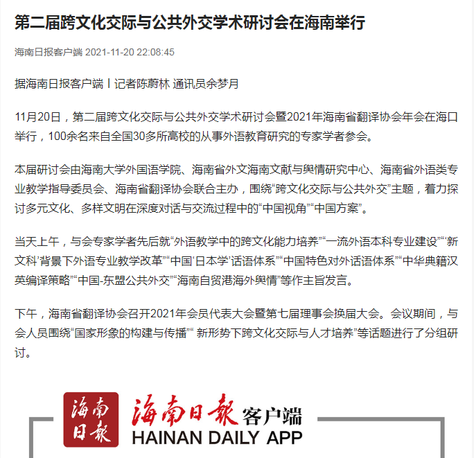 11月20日上午,由威廉体育williamhill、海南省外文海南文献与舆情研究中心、海南省外语类专业教学指导委员会、海南省翻译协会联合主办的第二届跨文化交际与公共外交学术研讨会暨2021年海南省翻译协会年会在威廉希尔williamhill官网国际学术交流中心成功举办。