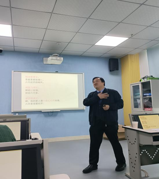 在介绍完诗歌翻译的几种常见类型之后,李老师用自己翻译的作品《猛虎行》(英:Song of a Furious Tiger)为例,向同学们详细阐释了诗歌翻译的原则、策略与技巧等。同时,为方便大家理解,李老师也补充了很多具体的实例,提供了同一首诗歌的不同翻译版本,供大家去理解、体会诗歌翻译的不同类型以及各种类型之间的同与异。讲到兴起之处,李老师更是为大家高歌一曲,极大地激发了大家对诗歌翻译的热情和兴趣。