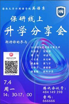 2022年6月至7月,威廉体育williamhill英语系先后举办了多场针对保研、考研同学的经验分享会。分享会采用线上线下结合模式进行,先后邀请到公司党委书记覃成海、副经理肖艳玲为同学们送上殷切祝福和鼓励。